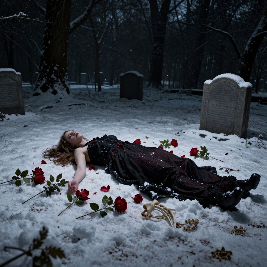A photograph of a young woman with pale skin and long brown hair, lying on a snow-covered cemetery ground, wearing a black, strapless gown. She is surrounded by red roses and a gold bracelet. She gazes upwards with a serene expression. Three tombstones are visible in the dark, snow-covered background. The scene is eerie and melancholic, with the contrast of her dark dress against the white snow and the red roses adding a dramatic effect. Snowflakes are gently falling, enhancing the somber mood.