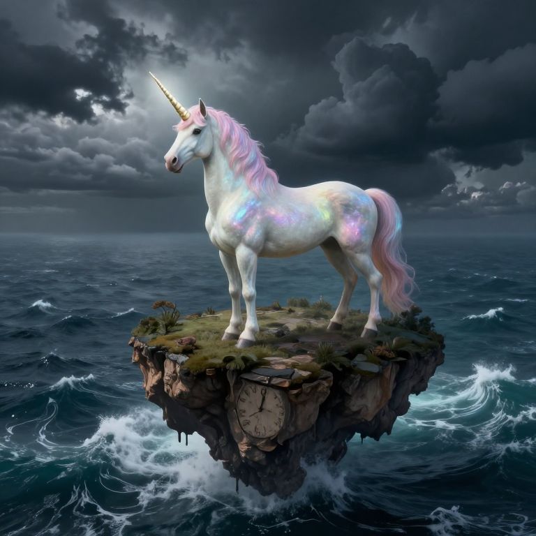 A surreal landscape featuring a majestic unicorn standing atop a floating island surrounded by tumultuous seas. The creature's body radiates iridescent hues, and its horn emits a gentle glow that illuminates the turbulent water below. From an aerial perspective, we observe the island's edge and the creature's silhouette against a sky filled with dark, foreboding cloud formations reminiscent of melting timepieces. This haunting yet captivating scene evokes feelings of wonder, curiosity, and subtle unease while capturing the essence of Dali-esque dreamscapes, infused with an element of ethereal fantasy.