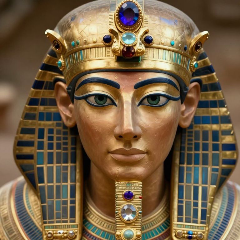 Digital painting of an ancient Egyptian woman with dark blue bob haircut, golden headdress, striped necklace, white dress, and gold pendant.