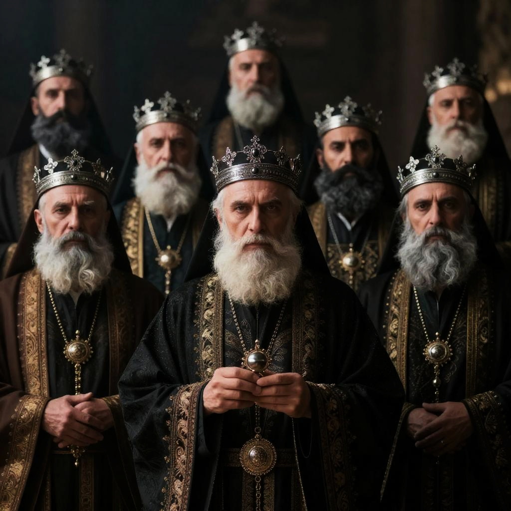 A group of nine men with long, messy hair and beards wearing medieval silver and steel armor and brown robes with gold trim. They have intense facial expressions and stand tightly packed in front of a stone wall. The man in the foreground wears a gold-trimmed brown robe, while the others are clad in shining armor, suggesting a medieval or fantasy setting.