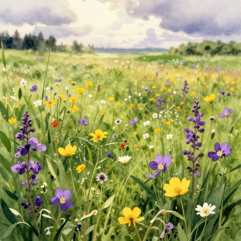 Genera of vibrant wildflowers in a lush meadow, sunlight filtering through clouds, detailed botanical elements, soft focus background, watercolor style, rich natural palette with greens, yellows, and purples, high resolution floral landscape