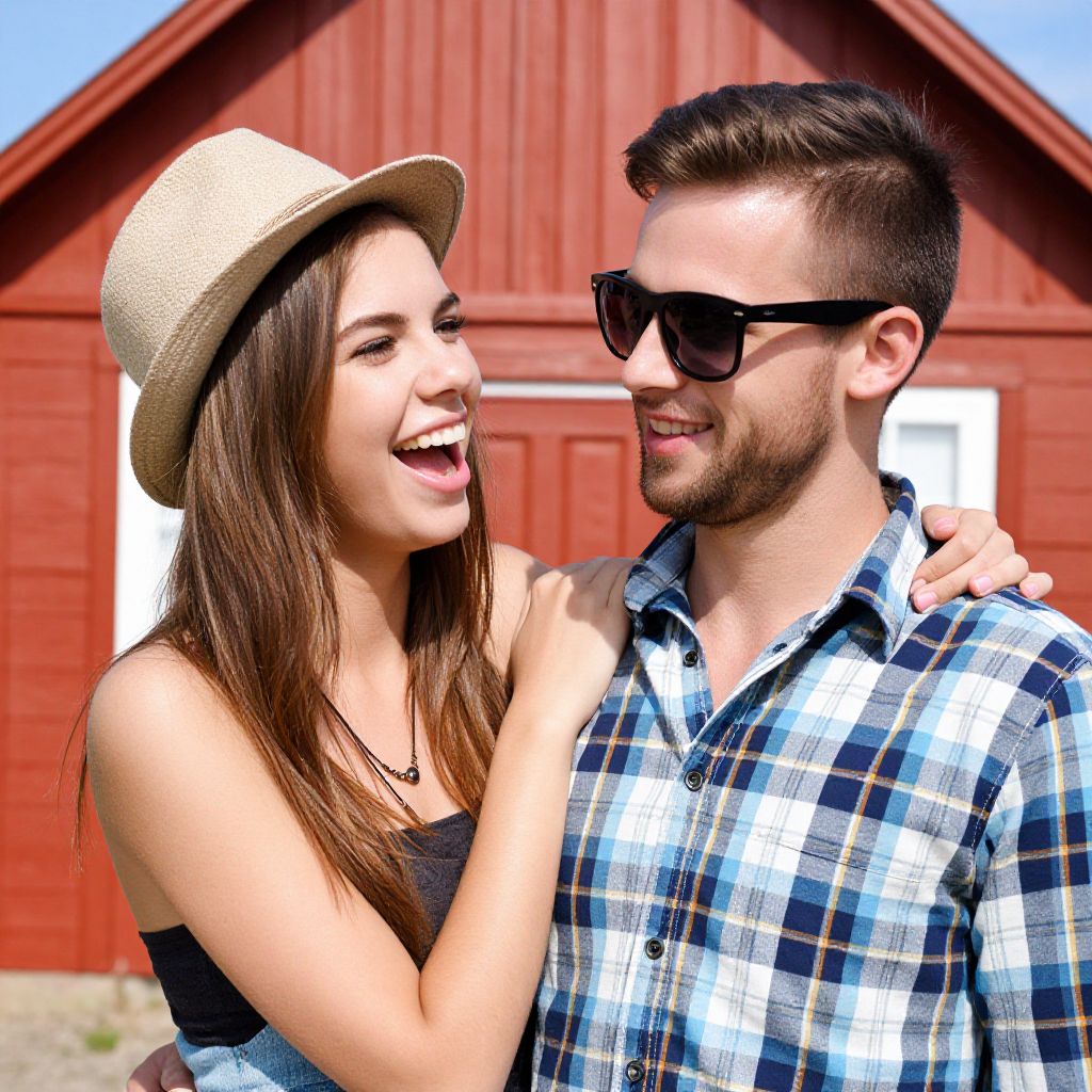 Photograph of a smiling young couple standing outdoors in front of a red wooden barn. The woman, with long brown hair, wears a beige straw hat and a black tank top, and has her right arm around the man's shoulder. She is laughing with her mouth open. The man, with short brown hair and a beard, wears black sunglasses and a blue and white plaid shirt. His left arm is relaxed by his side. The barn's red paint and triangular roof are visible in the background, with a clear blue sky above. The couple's casual, summer attire suggests a relaxed, happy moment.