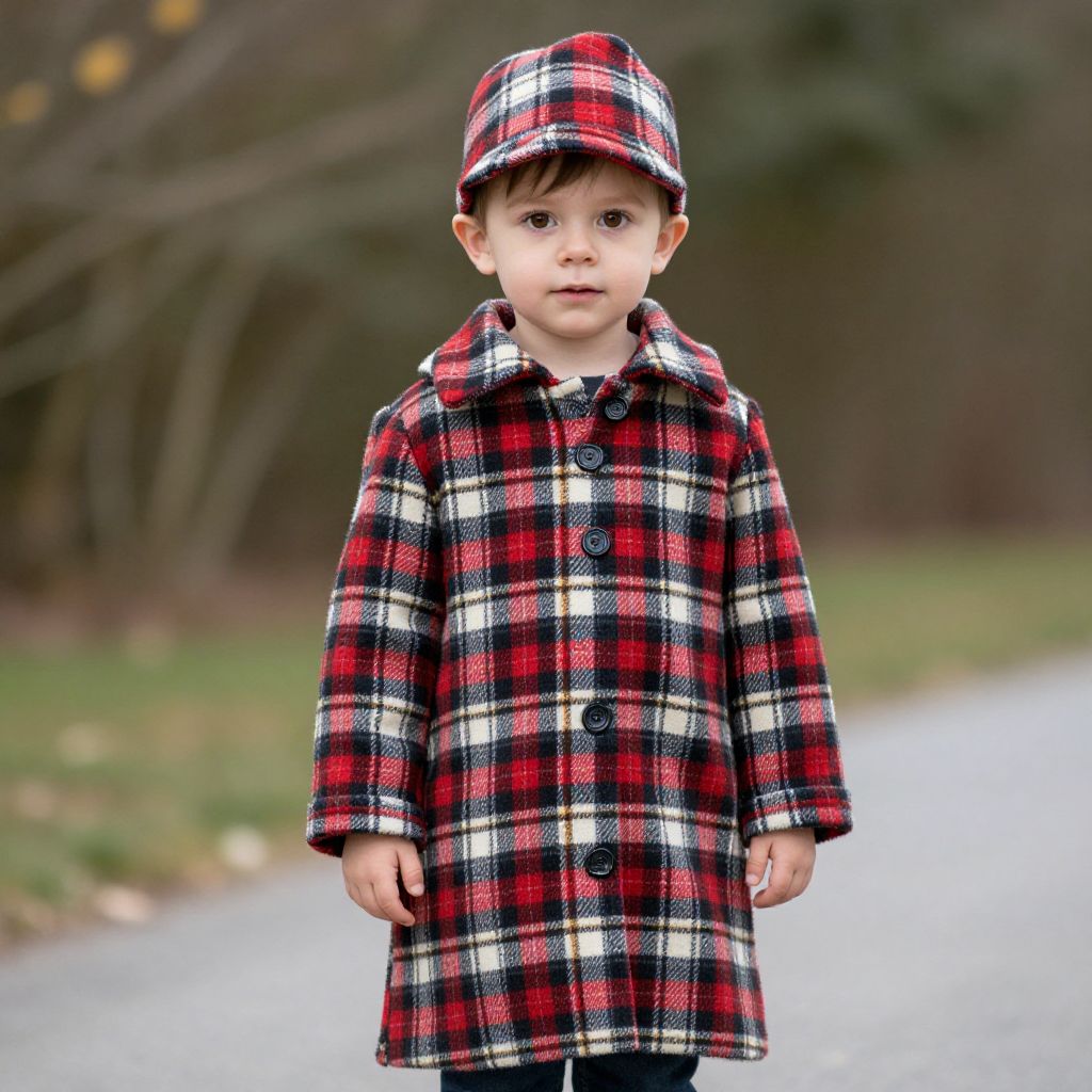 Photograph of a young boy standing on a gravel path in a blurred outdoor setting. He has fair skin, dark brown eyes, and short dark brown hair. He is wearing a red, black, and white plaid coat with a matching cap, buttoned up with a large white button in the center. His expression is neutral, and he stands with his hands by his sides. The background features indistinct trees and grass, with a mix of brown and green hues, indicating a late autumn or early winter setting. The coat's texture appears thick and warm.