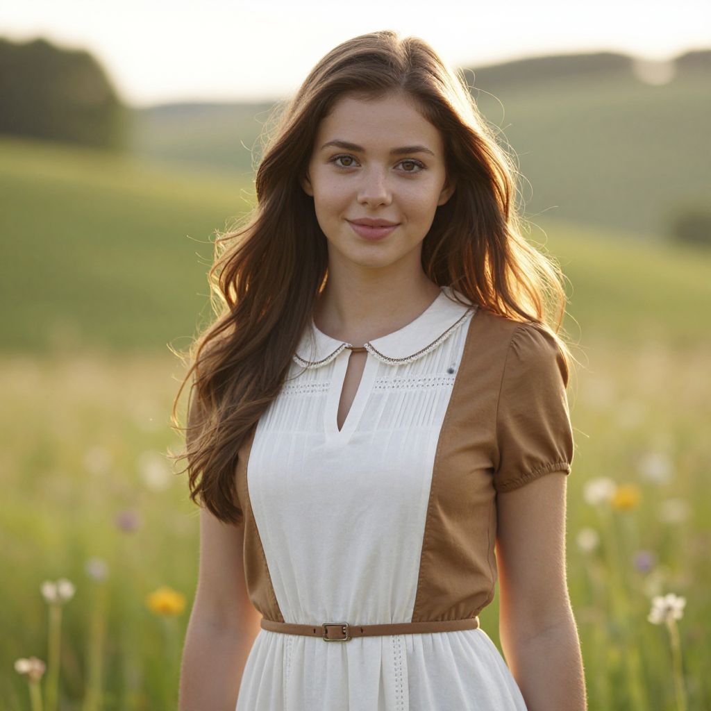 A beautiful young woman with long, flowing brown hair that gently falls over her shoulders, wearing a stylish brown and white dress with a delicate white collar and a subtle brown belt that accentuates her waist. She stands confidently in a soft, natural light, her eyes warm and inviting, with a gentle, heartfelt smile that exudes charm, warmth, and quiet confidence. The background features a serene countryside setting—rolling green hills, scattered wildflowers, and a faint golden hue of sunlight filtering through the trees, creating a peaceful and inviting atmosphere. The scene is beautifully composed with a natural, lifelike quality, evoking a sense of harmony between the person and her environment.