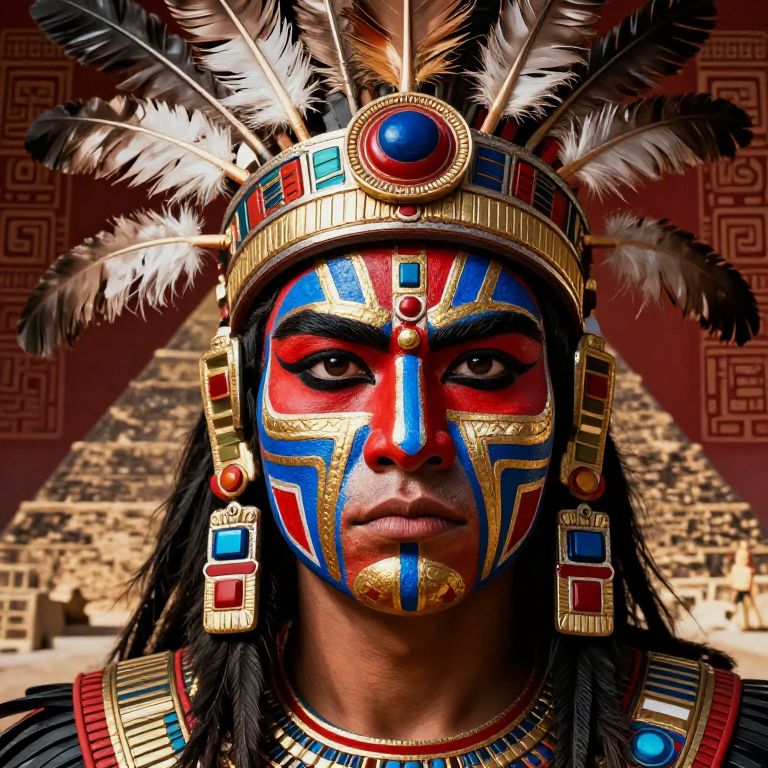 Aztec face paint on a warrior's face, vibrant red, blue, and gold geometric patterns, intense eyes, traditional feathered headdress, tribal background with ancient Aztec symbols and pyramids, dramatic lighting, highly detailed, cinematic style