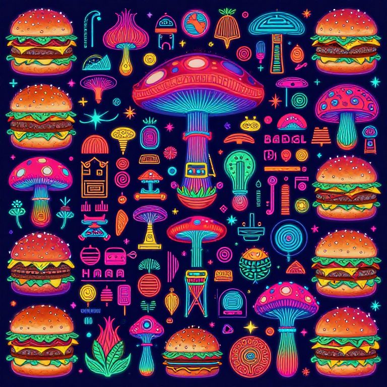 Beautiful panoramic hieroglyphics. neon colors. details everywhere. hamburgers as mushroom tops, wimmelbilder style. psilocybin psychedelia.,