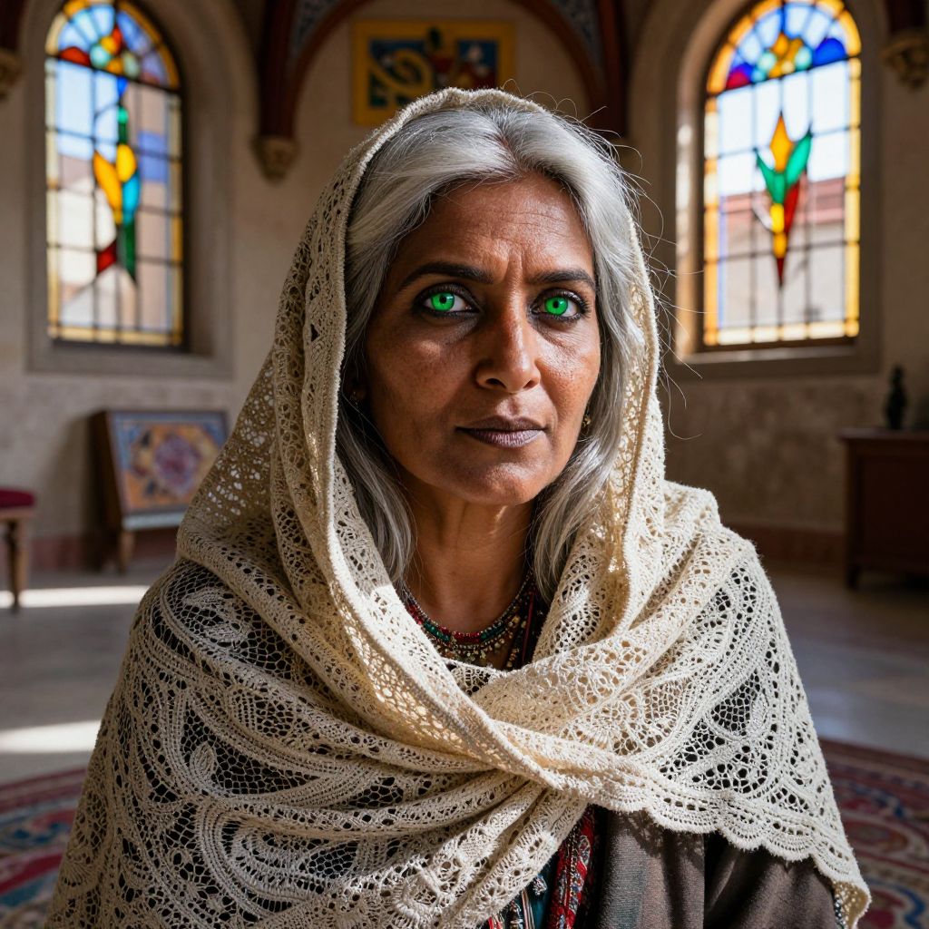 An enigmatic South Asian woman with olive skin and vibrant silver hair sits amidst an ancient Mediterranean village. Her deep green eyes, piercing yet warm, hold centuries of wisdom and a gentle mischief. Sunlight filters through stained glass windows, illuminating her face and the intricate lace shawl draped across her shoulders. The unique perspective captures not only her striking features but also the interplay of light and shadow on her face, subtly incorporating elements of the vibrant architecture around her. This portrait encapsulates a life well-lived, evoking an emotional gradient that resonates with reverence for tradition and curiosity about the unknown.