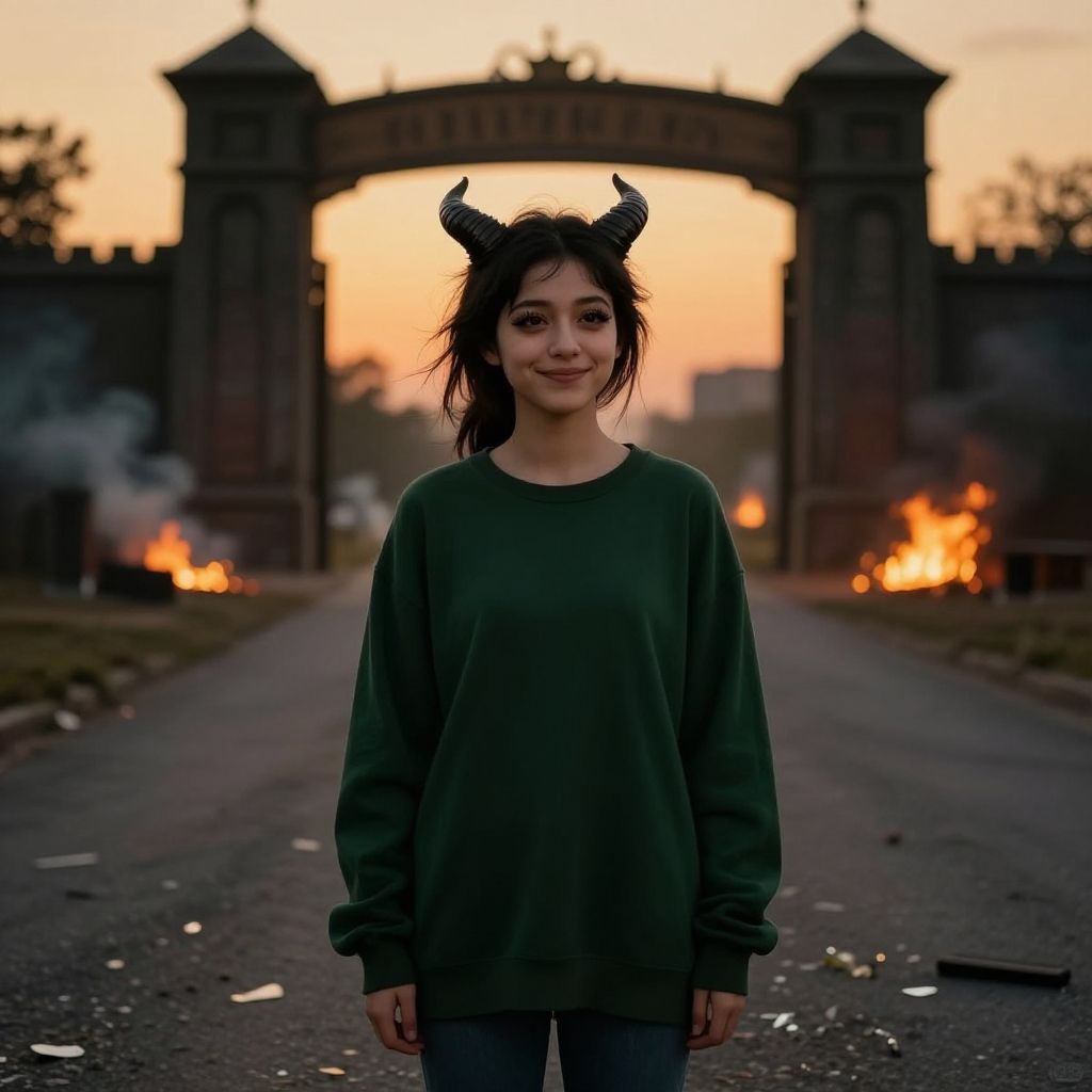 Masterpiece, (8:00 pm), after sunset, amber glow, Rembrandt lighting, photorealistic, sharp focus, from a standing position, 1girl, 26-year-old succubus, (cute: 1.5) (petite: 1.3), black hair, (bushy ponytail: 1.3), (small horns: 1.3), (tiny body: 1.5) (160cm height: 1.5) (small breasts: 1.5) With Thick Eyelashes, small mouth, (realistic skin texture: 1.3), dark hazel eyes, (extremely delicate: 1.3), at the entrance to the demon realm, (wide gate: 1.3), (broad road: 1.3), (paved with good intentions: 1.3), rubble, trash, debris, litter, broken glass, fire, explosions, smoke, wearing a (large, boxy, dark-green (crew-neck: 1.3), long-sleeve shirt) and (jeans), (wistful, nostalgic, amused, laughing, smile)