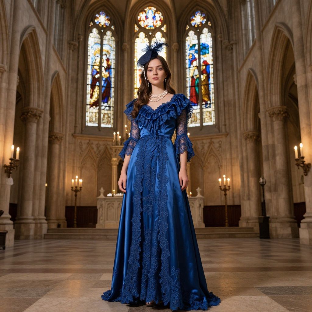 Full body portrait of a young woman with long brown hair wearing an elegant long blue silk dress with intricate lace details and ruffled sleeves. She wears a feathered hat and pearl accents while standing inside a grand Neo-Gothic cathedral illuminated with gentle candlelight. The setting features large stained glass windows and tall stone archways, contributing to the refined and graceful atmosphere.