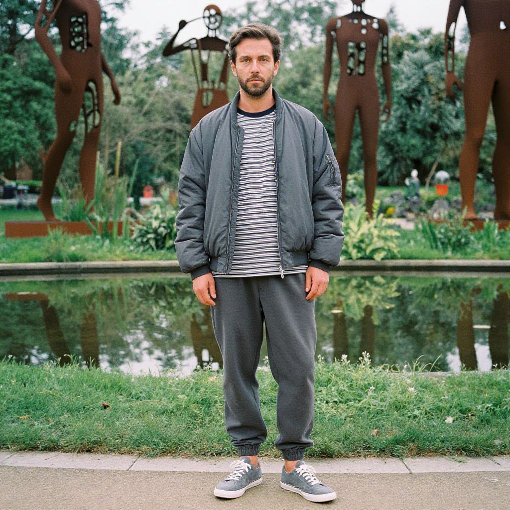 Photograph of a bearded man with short brown hair, standing outdoors in front of a reflective pond. He wears a black and white striped shirt, a dark blue bomber jacket, gray sweatpants, and white sneakers. The background features tall, rust-colored, abstract metal sculptures and lush greenery. The man's expression is neutral, and he stands with his hands by his sides on a paved path. The overall scene is bright and colorful, with a mix of natural and man-made elements.