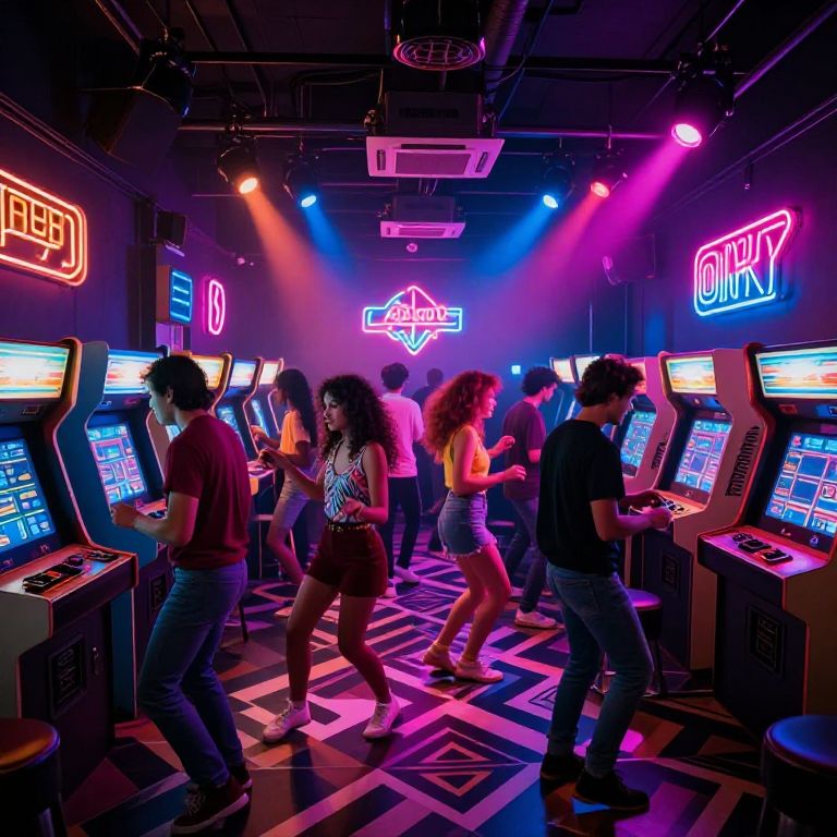 Retrowithin themed night club interior, crowd dancing under bright neon signs, retro arcade machines lining walls, smoky atmosphere with colorful spotlights, 80s fashion outfits, geometric patterns on floors