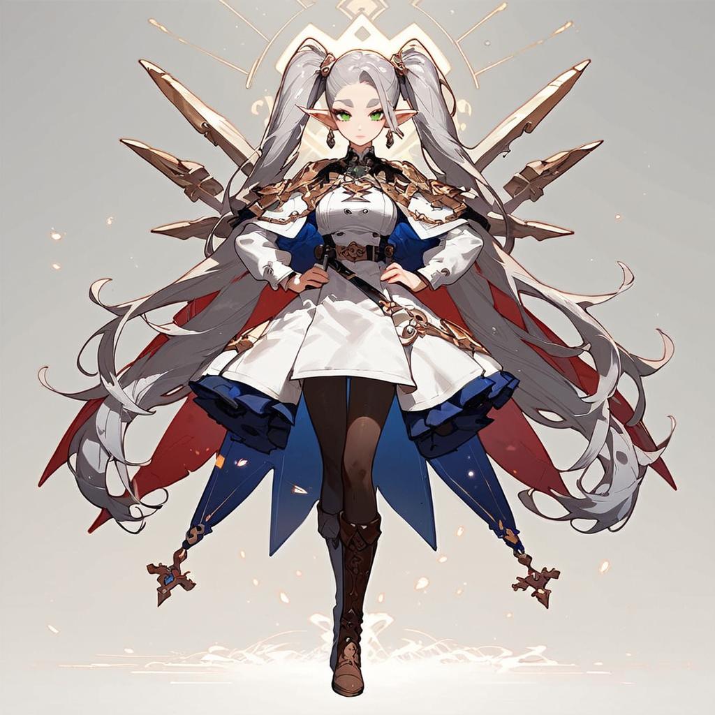 Score_9, score_8_up, score_7_up, score_6_up, score_5_up, score_4_up, , source_cartoon, source_anime, 1girl, frieren, green eyes, grey hair, twintails, thick eyebrows, pointy ears, white capelet with long sleeves, earrings, black belt, black pantyhose and brown boots, solo, full body, hands on hips, looking at viewer