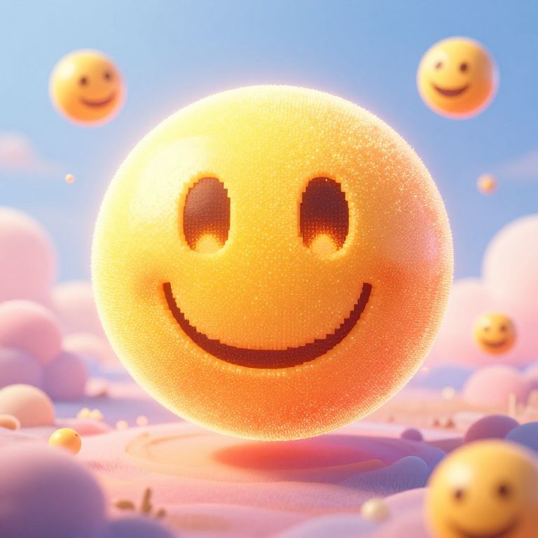 Emoj concept illustration, a large happy face emoji made of tiny glowing pixels, dissolving into smaller emojis that float around a surreal dream-like landscape, pastel colors, light and shadow play, high detail, fantasy art style
