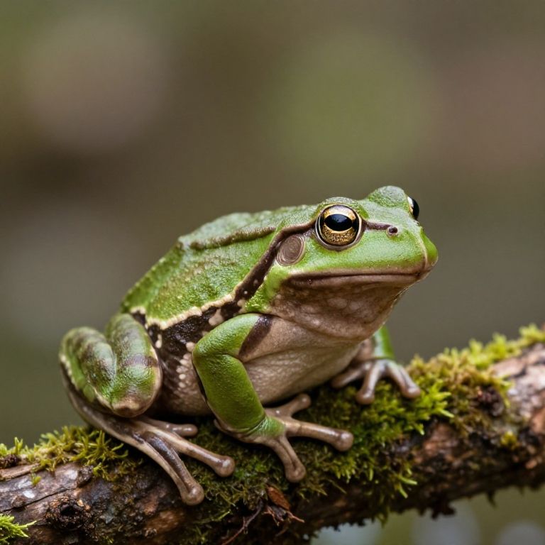 Photograph of a vibrant green tree frog with a smooth, glossy skin and prominent black eyes, perched on a moss-covered branch. The frog's underbelly is a lighter shade of green, and it has distinct brown stripes along its sides. The background is a blurred mix of greens and browns, highlighting the frog as the focal point. The frog's toes are splayed, gripping the branch, and its head is turned slightly to the right. The texture of the moss is detailed and lush, contrasting with the frog's smooth skin. The image is sharply focused on the frog, with a shallow depth of field.
