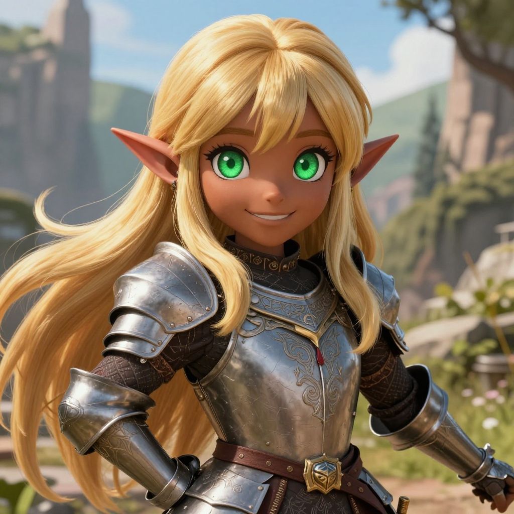 CGI image of a blonde, green-eyed elf girl with pointed ears, wearing silver medieval armor, smiling in a sunny, mountainous landscape.