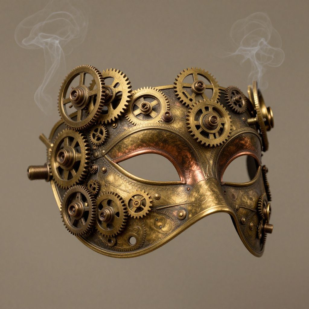 Mask concept art inspired by steampunk aesthetics, brass and copper materials, intricate gears and screws, smoke gently drifting around, warm sepia tones, blending Victorian elegance with industrial grit, detailed craftsmanship focusing on function and style.