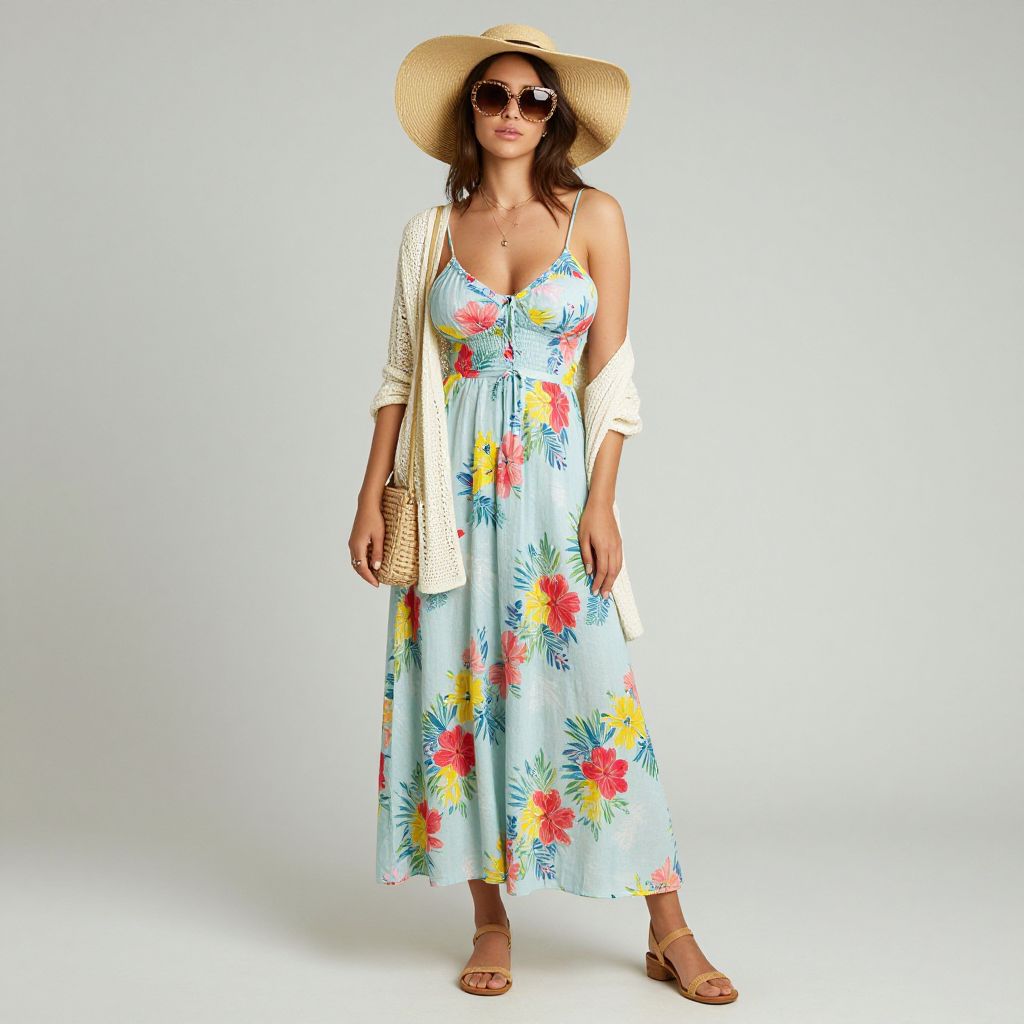 Full body shot, Hourglass woman, lightweight linen sundress, vibrant floral print, spaghetti straps, cinched waist, flowing skirt, breathable cotton cardigan, soft pastel color, wide-brimmed straw hat, natural fibers, oversized sunglasses, chic sandals, woven texture, crossbody bag, tropical-themed accessories, delicate gold jewelry, minimalistic design, comfortable fit, relaxed vibe Sexy. Pretty face and beаutiful eyes. Big breasts