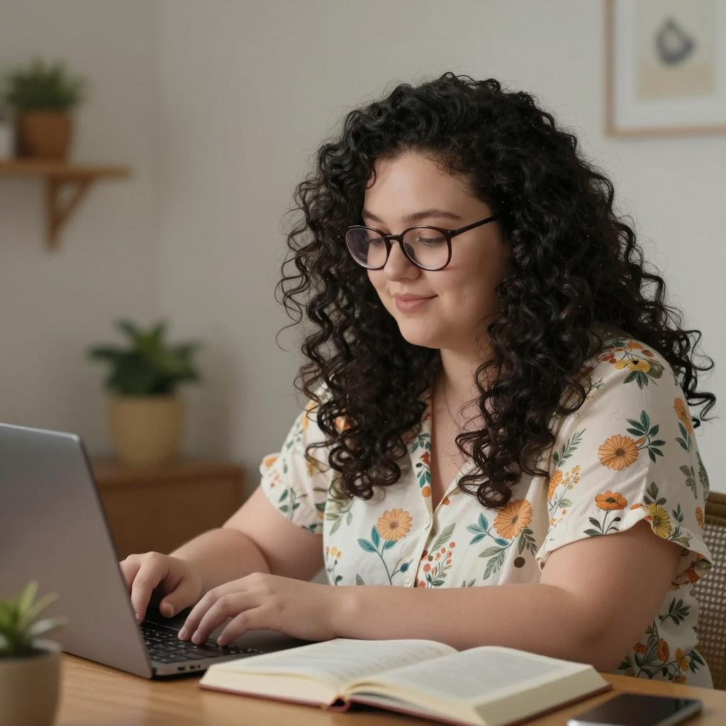 A young woman with long brown hair and black glasses wears a cream-colored turtleneck sweater while sitting at a wooden picnic table outdoors in a park during spring. She is writing in a spiral notebook with a pencil, surrounded by green grass and blooming trees under soft natural light, creating a casual and cozy atmosphere.
