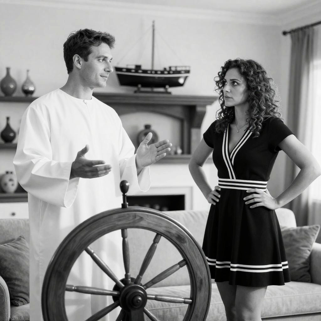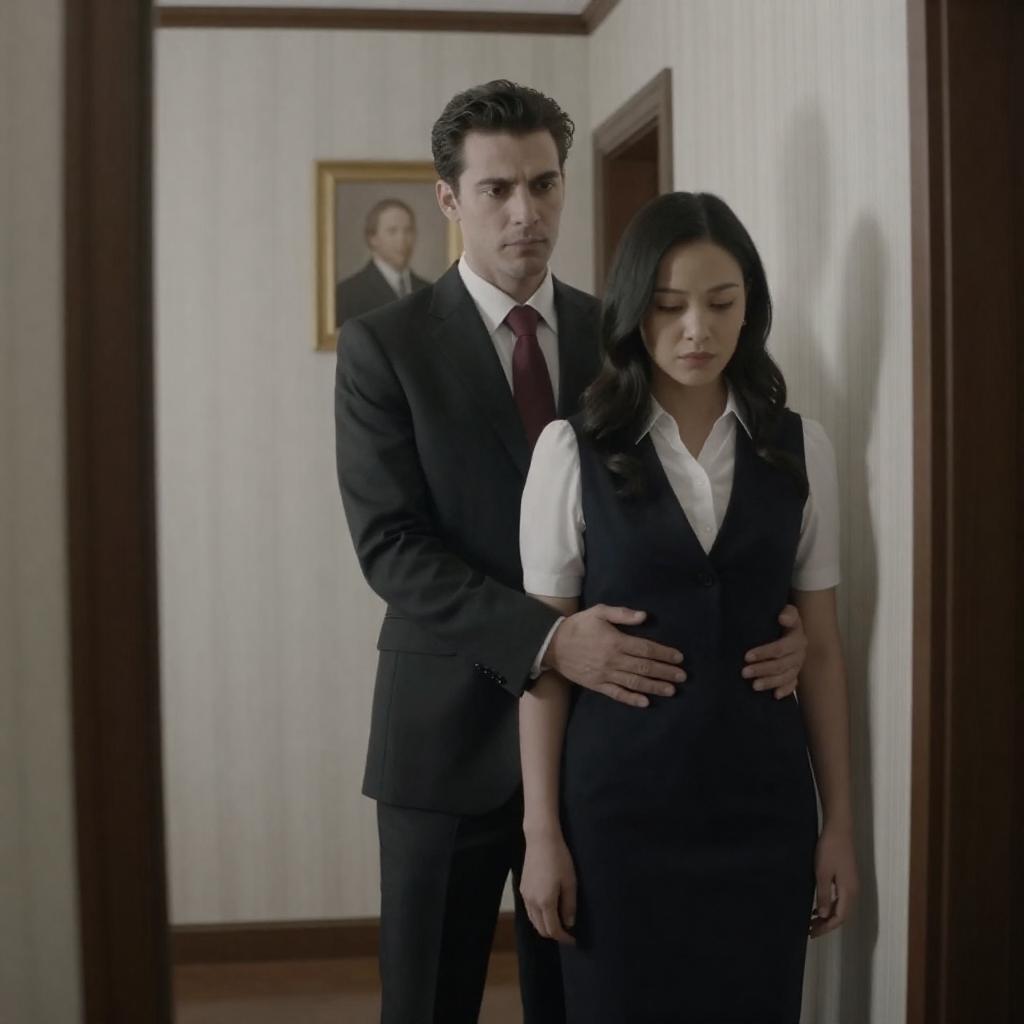 Photograph of a film still. Man in blue robe with dark hair, standing, gently touching a woman's forehead. Woman with wavy brown hair, red dress, sitting on green upholstered sofa. Green curtains in background. Man looking down at woman, who looks up at him. Yellow border on left. 5 fingers title graphic on bottom left. Man's right hand on woman's head, left hand on hip. Woman's hands on sofa. Intense facial expressions.
