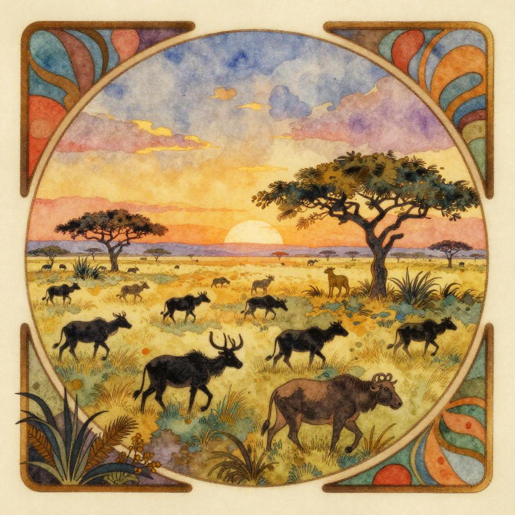Iconic oil painting of Serengeti National Park, Tanzania, with wildlife herd in the foreground, impressionistic style. Energetic brush strokes, sunset reflections on water, golden hour lighting, intricate details, directional soft lighting, highly detailed.