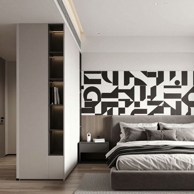 Modern design interior decor showcasing a contemporary bedroom with a clean lines bed, built-in storage, and a statement headboard in a bold geometric pattern.