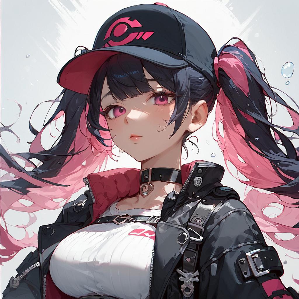 Score_9, score_8_up, score_7_up, score_6_up, source_anime, 1girl, solo, long hair, bangs, black hair, twintails, pink hair, multicolored hair, pink eyes, two-tone hair, split-color hair, jacket, choker, belt, black jacket, black headwear, cropped jacket, hat, large breasts, under the water