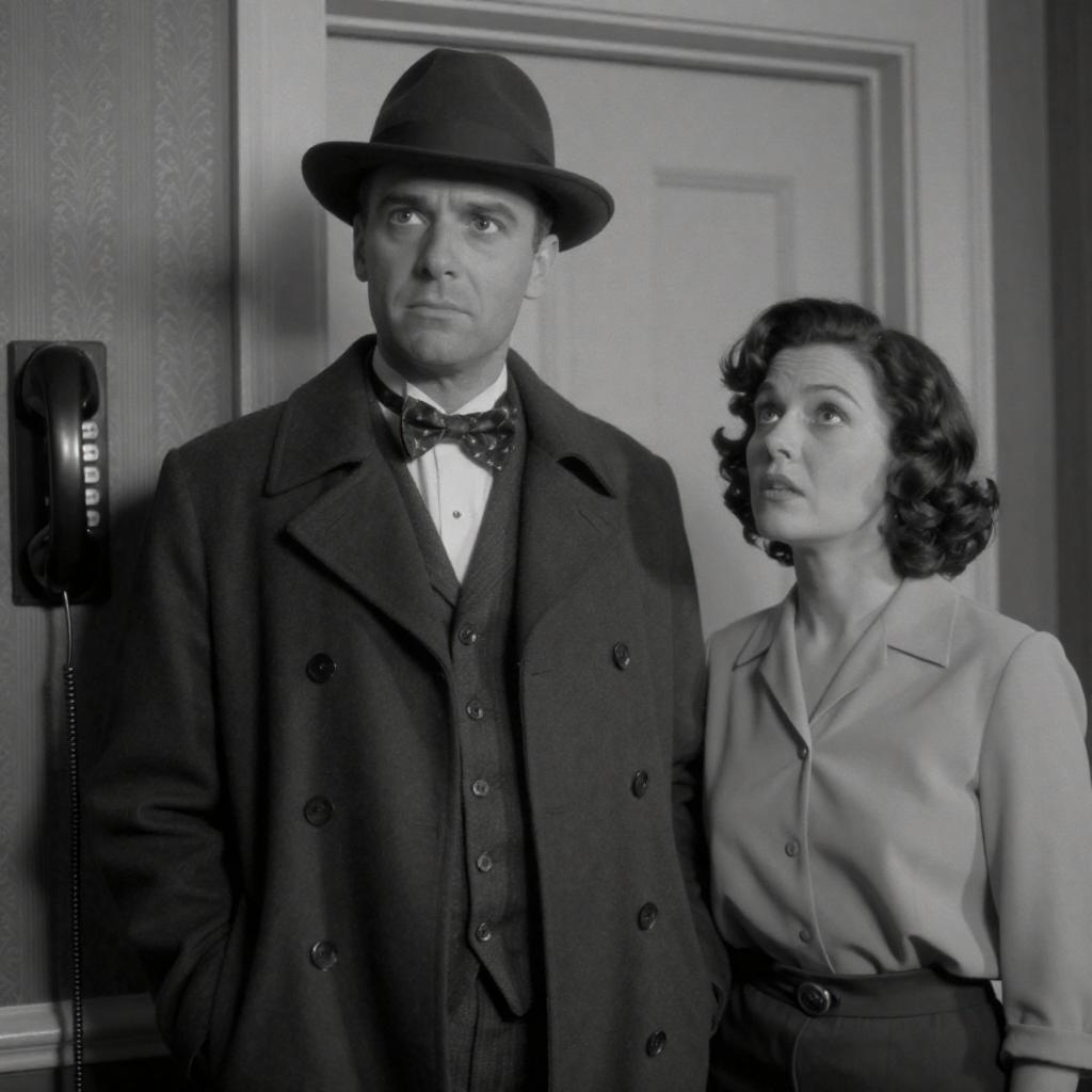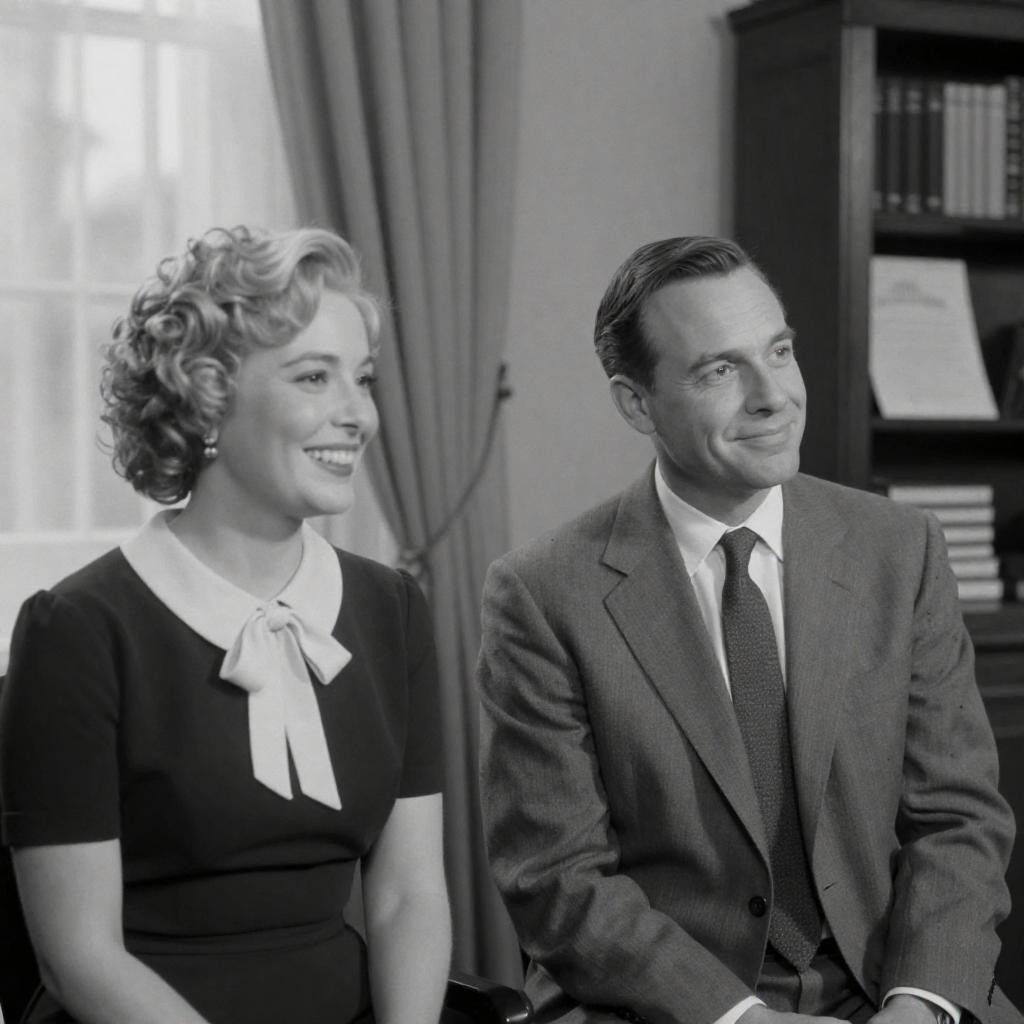 Black-and-white photograph of four people. A man in a suit speaks to three women. First woman in checkered dress looks surprised. Second woman with pearl necklace and dark hair smiles. Third man in suit with short hair looks serious. Background includes patterned curtain and stone wall. All stand closely together.