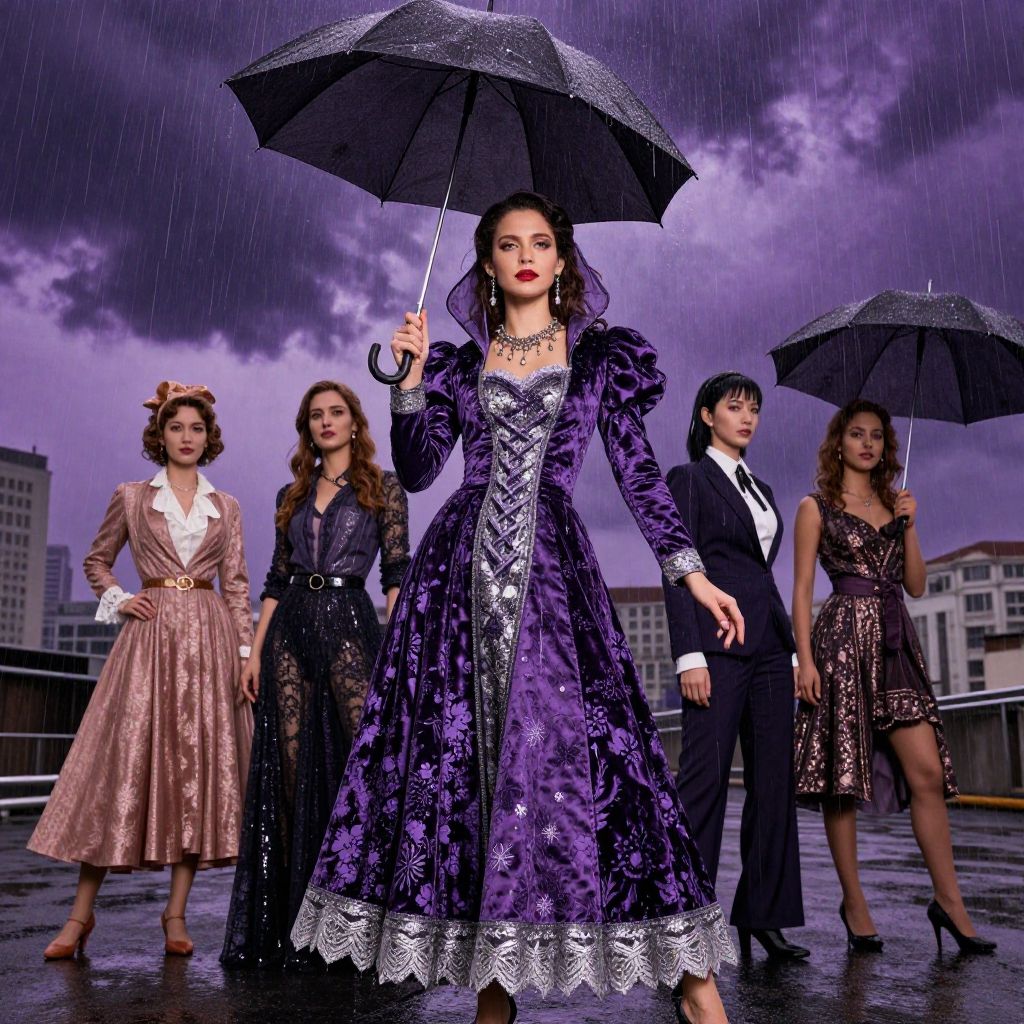 Dynamic purple rain costume female, theatrical ensemble combining vintage and modern elements, velvet and silk fabrics with rain-inspired patterns, delicate lace and metallic accessories, dramatic umbrella prop, vibrant stormy sky with rain streaks in a cityscape