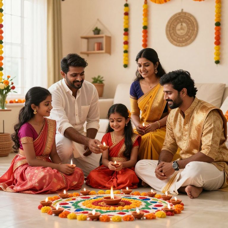 Prompt image tamil: A modern Tamil family celebrating Diwali in a bright home, adorned with diyas, rangoli patterns, and traditional attire, capturing festive joy and regional heritage with rich textures and warm color palette.