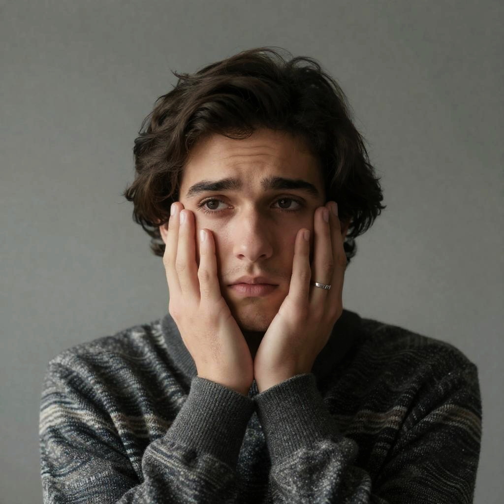 Man with medium brown hair, wearing a white t-shirt and blue plaid jacket, raises his right hand with an open palm, mouth open in surprise. Indoor setting with white columns and bright light. Photorealistic style.