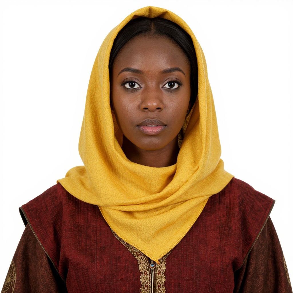 Emo photography, portrait headroom, female medieval mage, African wearing 14th Century Europe costume, yellow scarf, 25% solid white background, 8k, highly detailed,