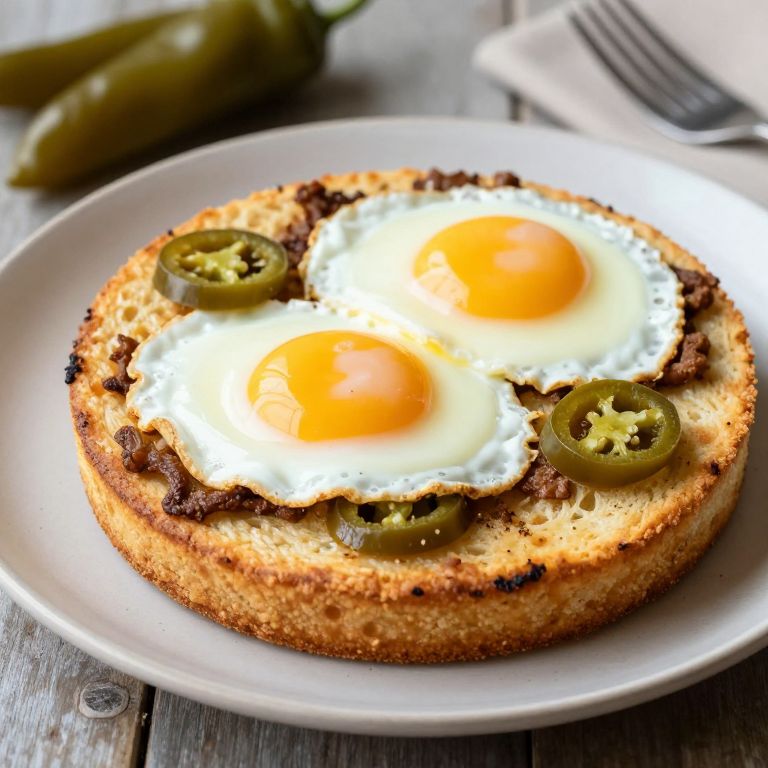 Photograph of a round, golden-brown, crispy flatbread topped with two sunny-side-up eggs, their bright yellow yolks contrasting with the white of the eggs. Four green jalapeño slices are evenly spaced around the eggs. The flatbread has a textured, slightly charred crust. The white plate holding the flatbread rests on a rustic wooden table. In the blurred background, two additional green jalapeños are visible. A folded white cloth and a fork are partially seen in the top right corner. The image is brightly lit, emphasizing the textures and colors.
