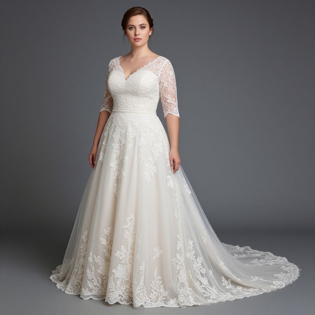 Model showcasing an elegant half-sleeve lace and tulle plus-size wedding dress by FATFADRESS, featuring intricate floral embroidery and a flowing skirt with a subtle train.