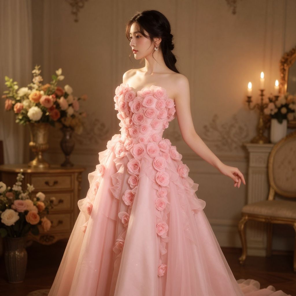 Photograph of an elegant Asian woman with long black hair in an opulent, pink, strapless ball gown adorned with numerous rose-like fabric flowers. The gown's voluminous skirt features a cascading effect of soft pink tulle. She stands in a grand, warmly lit room with ornate white walls, gold accents, and a wooden dresser with a floral arrangement on the left. Candles on the right add a romantic ambiance. The woman's delicate features are highlighted by the soft lighting, and she gazes to the side with a serene expression.