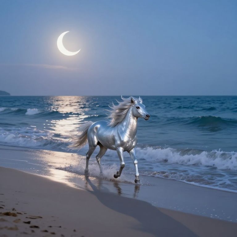 Picture a serene beach landscape illuminated by the soft light of a crescent moon, casting elongated shadows on the pristine sand below. In this tranquil setting, an enchanting creature gracefully wades in the gentle surf, its shimmering coat reflecting the lunar glow like liquid silver. The majestic being's flowing mane dances with each wave, evoking an emotional gradient between peace and wonder as it emerges from the sea, its gaze fixed on the starlit horizon. This magical fusion of ethereal fantasy and natural beauty captures the imagination and stirs the soul in a harmonious blend reminiscent of dreamlike nocturnes.