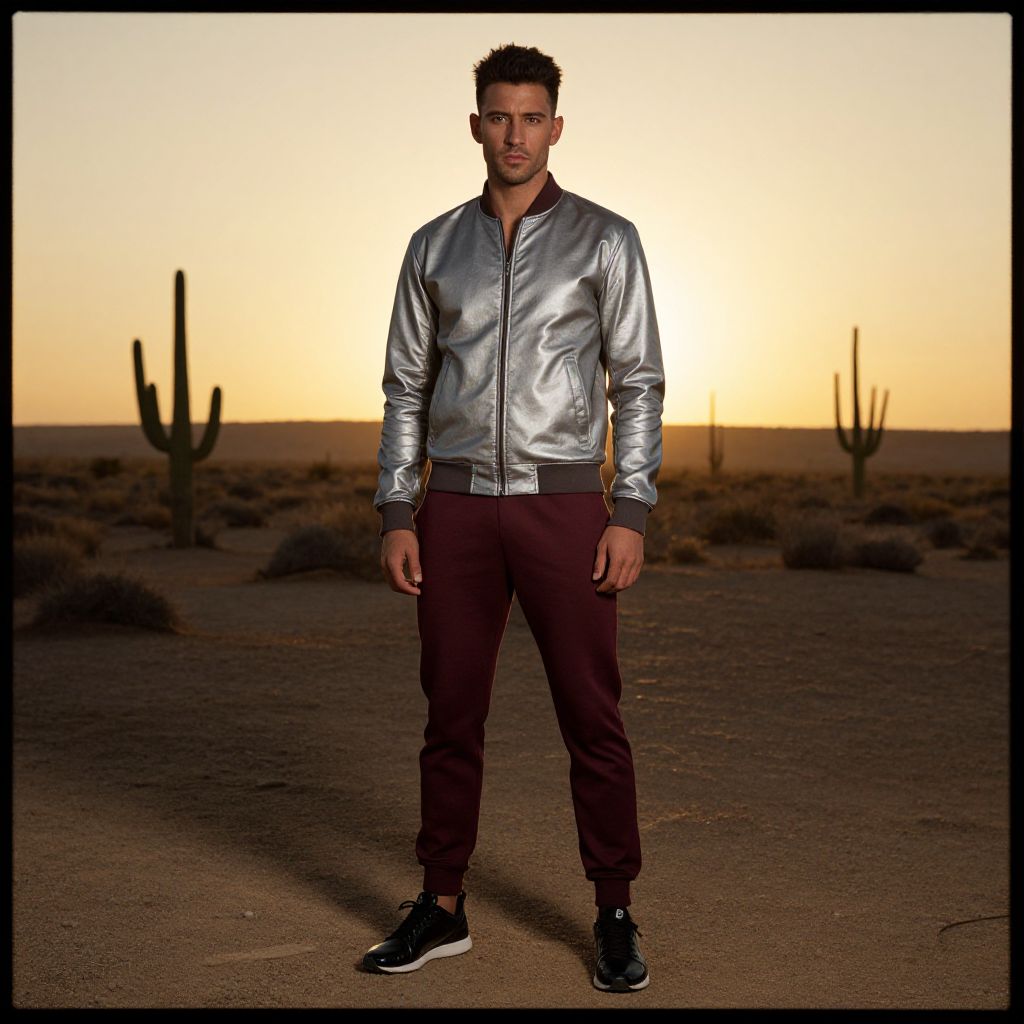 A man, reflective tech jacket in silver, slim-fit jogger pants in deep burgundy, sleek black trainers, arid desert landscape, scattered cacti, golden sunset, daguerreotype film style, contemplative expression. Man has masculine face and piercing eyes