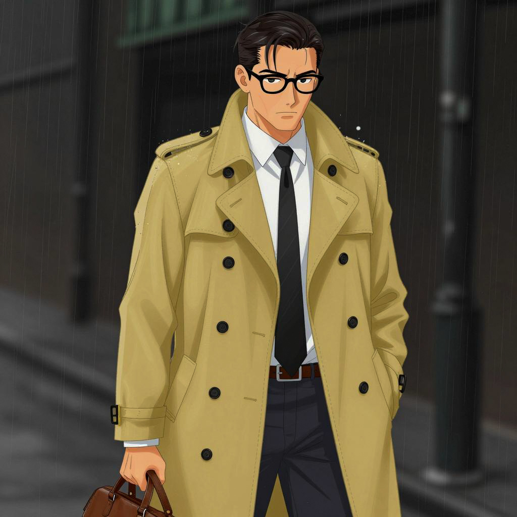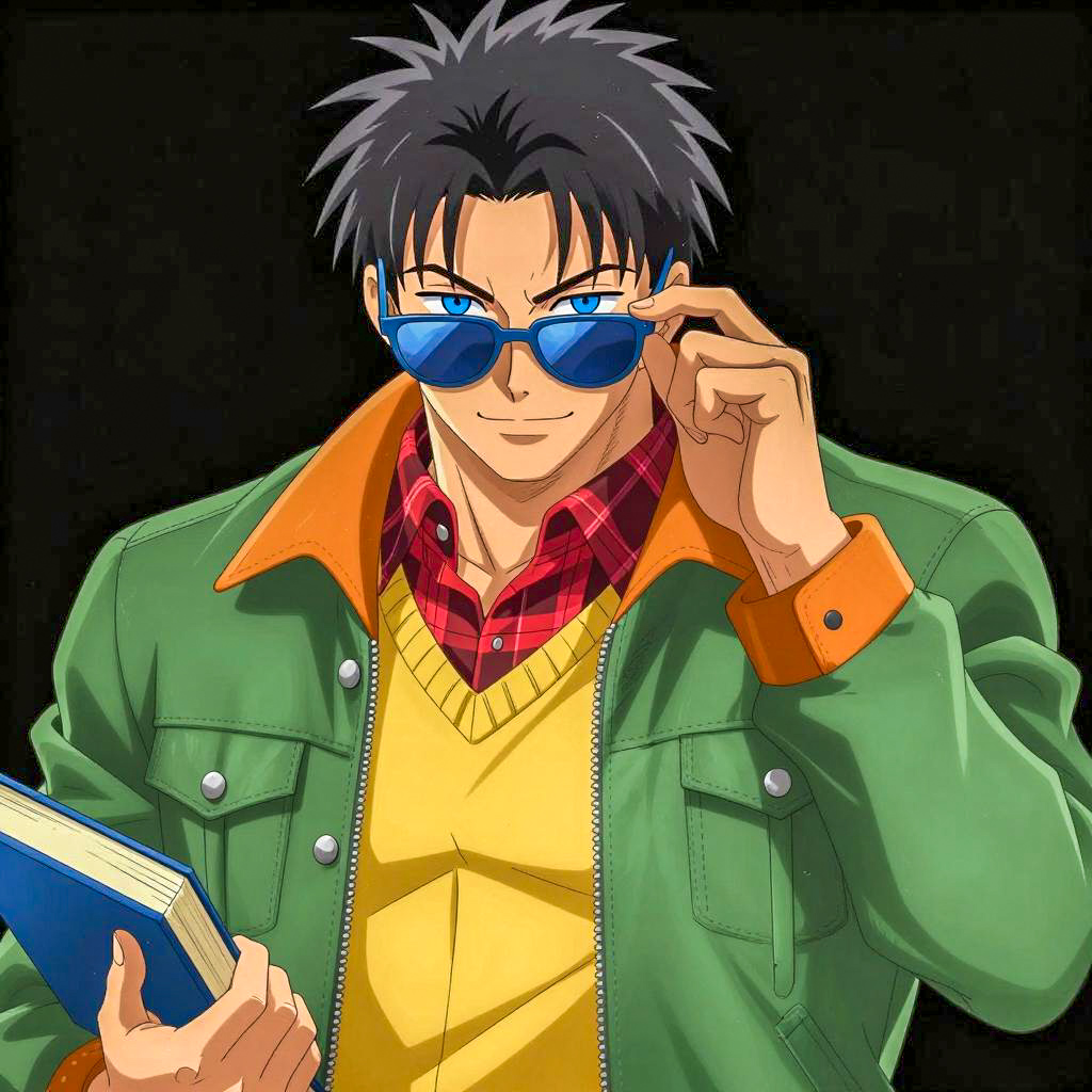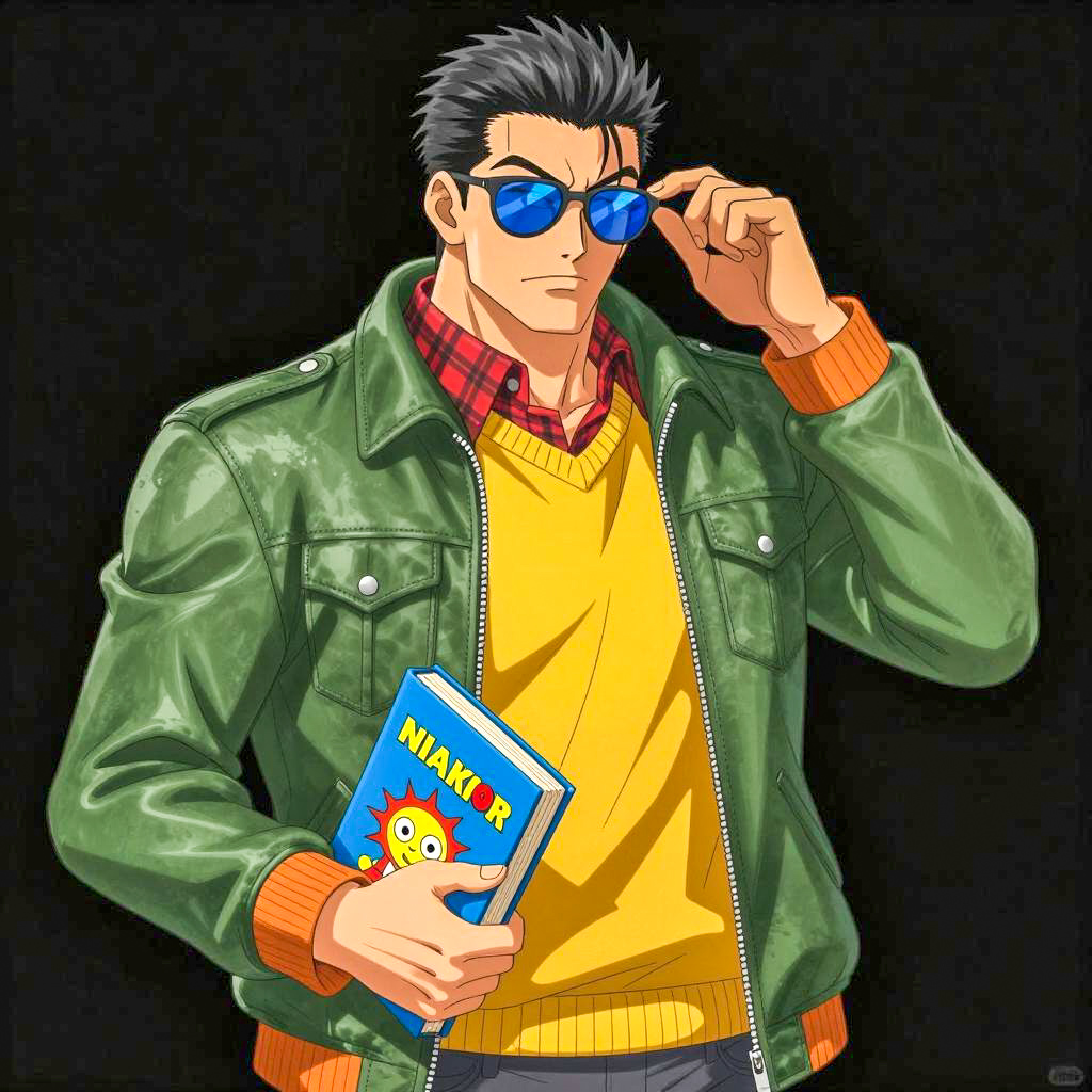 Anime-style digital illustration of a muscular man with spiky black hair, blue eyes, and fair skin. He wears a green jacket with an orange collar over a yellow sweater and red plaid shirt. He holds a blue book in his left hand and adjusts his blue sunglasses with his right hand. Black background. He has a slight smile and intense eyes.