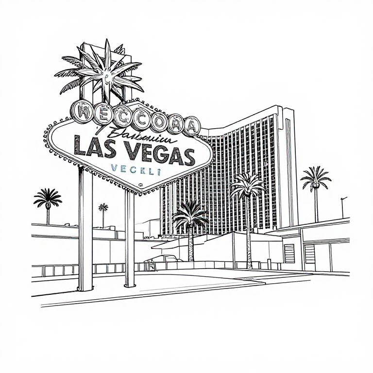Black-and-white line drawing of the Las Vegas sign with palm trees, tall buildings, and a marquee-style sign reading "Las Vegas".