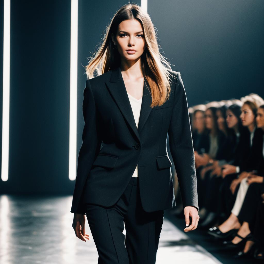 Straight with Side Part hairstyle on woman, wearing chic attire, in fashion runway, captured in fashion editorial style with soft light.