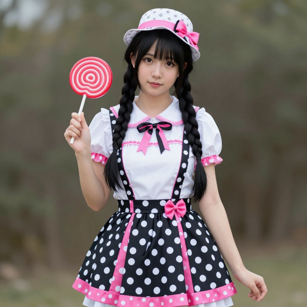 Lollipop lady costume, 1girl, solo, twin braids, dress, braid, realistic, polka dot, black hair, hat, polka dot dress, long hair, looking at viewer