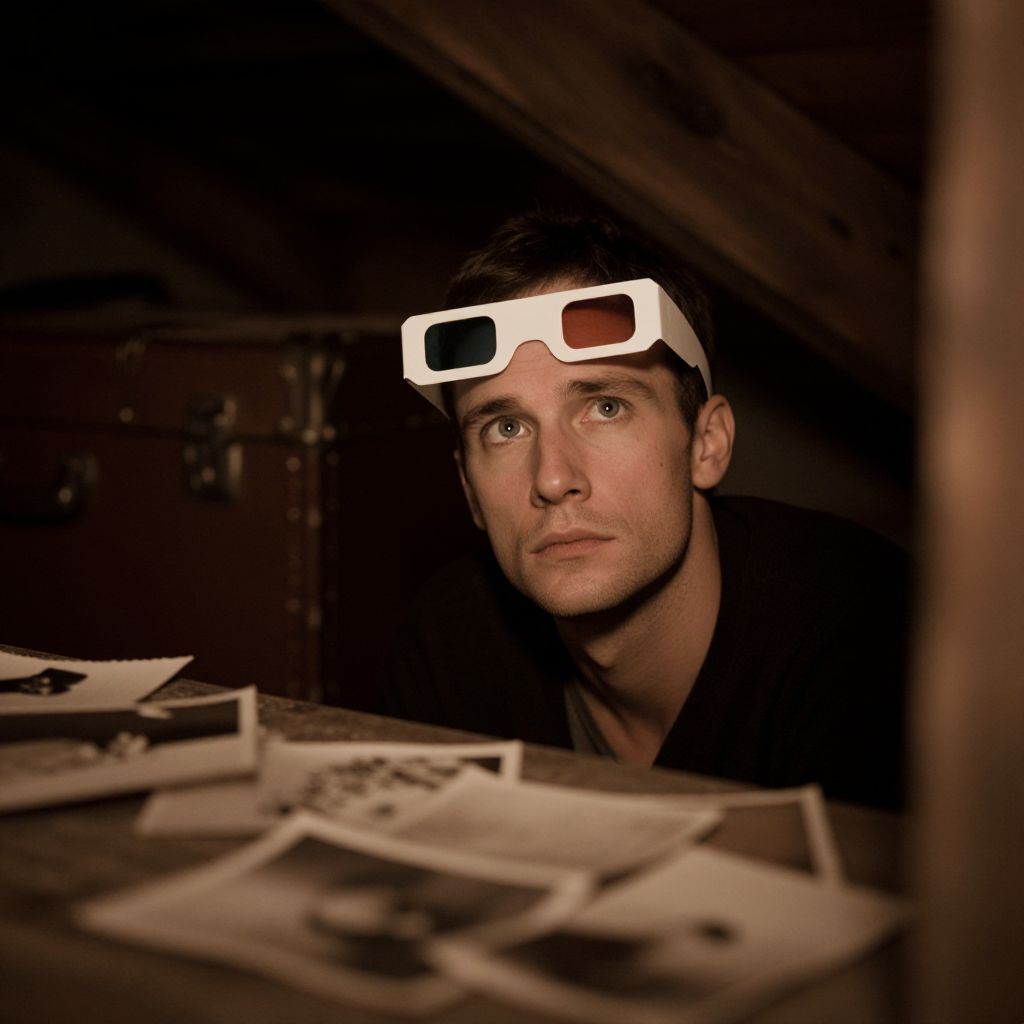 Intimate, dimly lit attic scene, soft focus, sepia toned photographs scattered around the subject, aged wooden beams and dusty trunks provide a nostalgic backdrop, the man's contemplative gaze lost in thought, 3D anaglyph glasses perched on his forehead, capturing the essence of nostalgia. Man has masculine face and piercing eyes