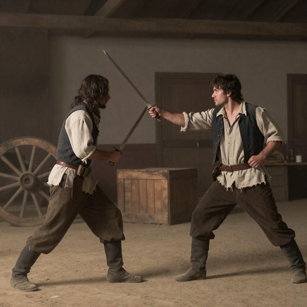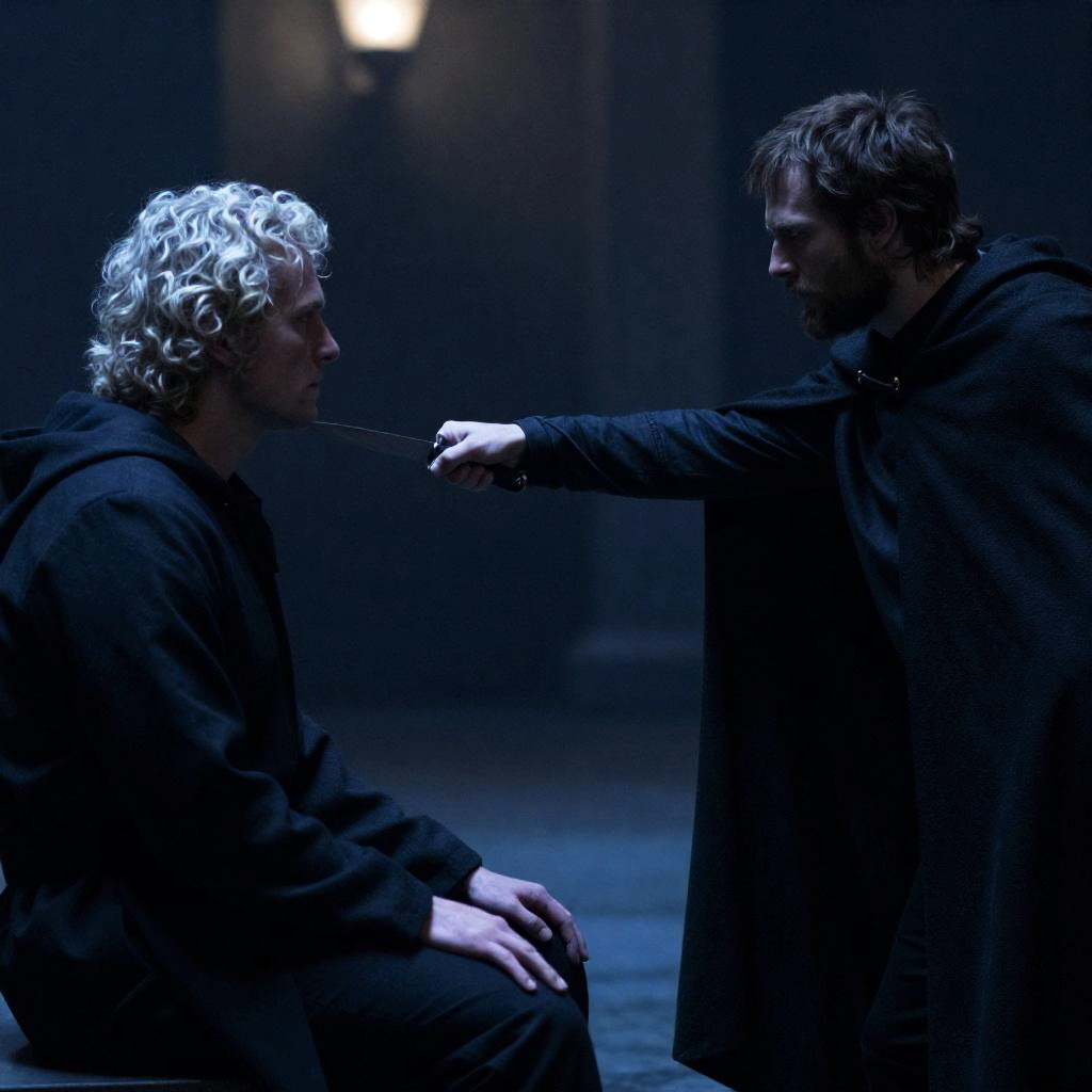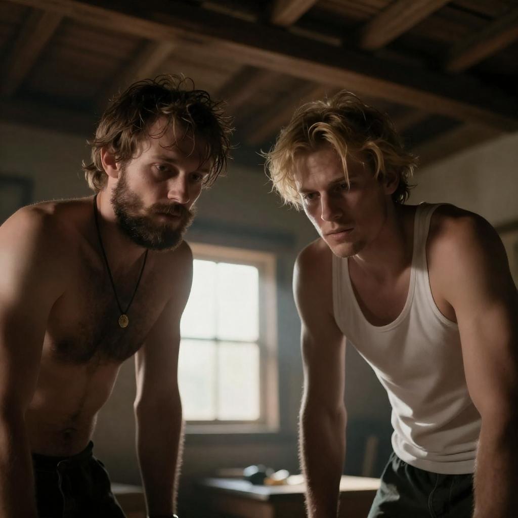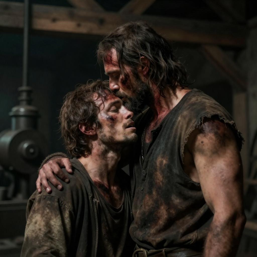 Two dirty, disheveled men in rustic clothing, in an industrial, dimly lit setting. The taller man with long hair, beard, and blood on his face, aggressively kisses the shorter man's forehead. Background includes wooden beams and industrial equipment. Both men's faces show intense expressions.