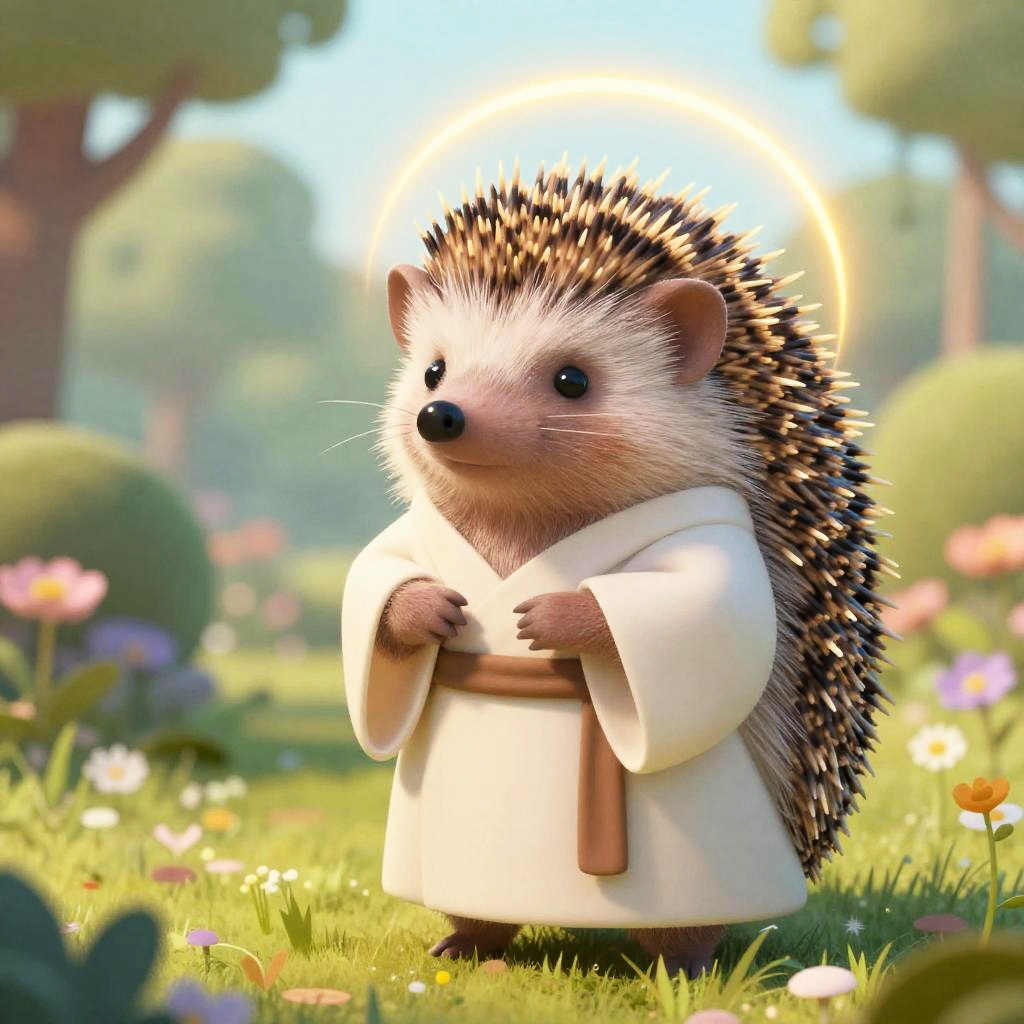 Jesus the hedgehog depicted as a serene anthropomorphic figure, wearing a flowing robe and glowing halo, in a lush garden with soft, pastel colors
