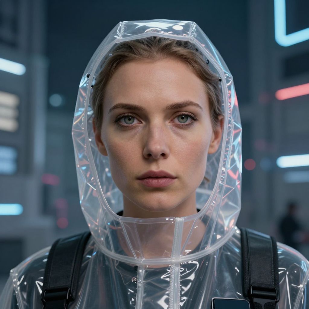Photorealistic CGI: Curly-haired woman in red dress holding a brain, standing in a sci-fi lab with colorful stained glass, monitors, and