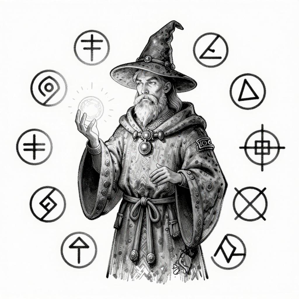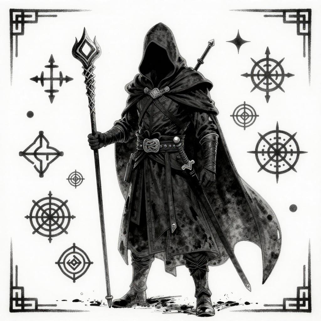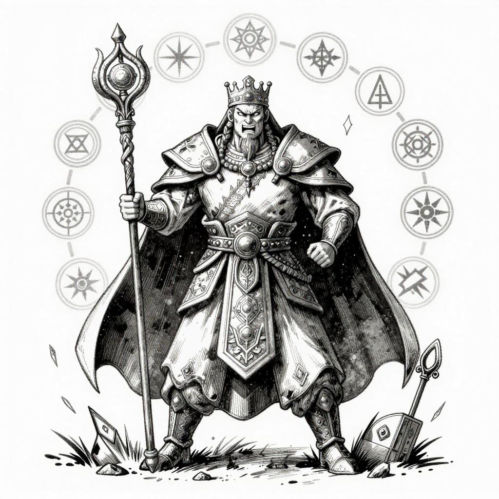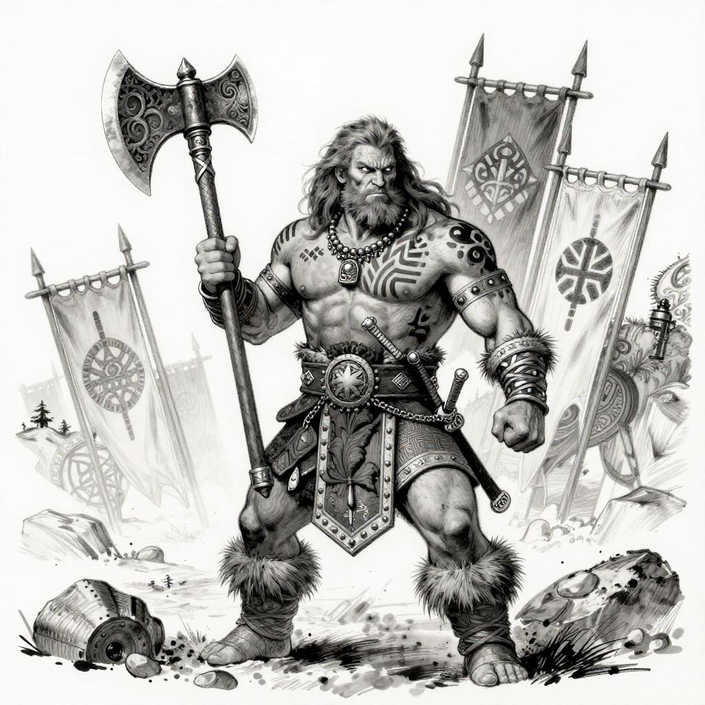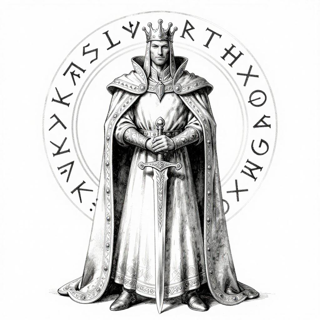 Black-and-white ink drawing of a heroic knight in shining armor, wielding a sword, surrounded by banners, traditional fantasy illustration.