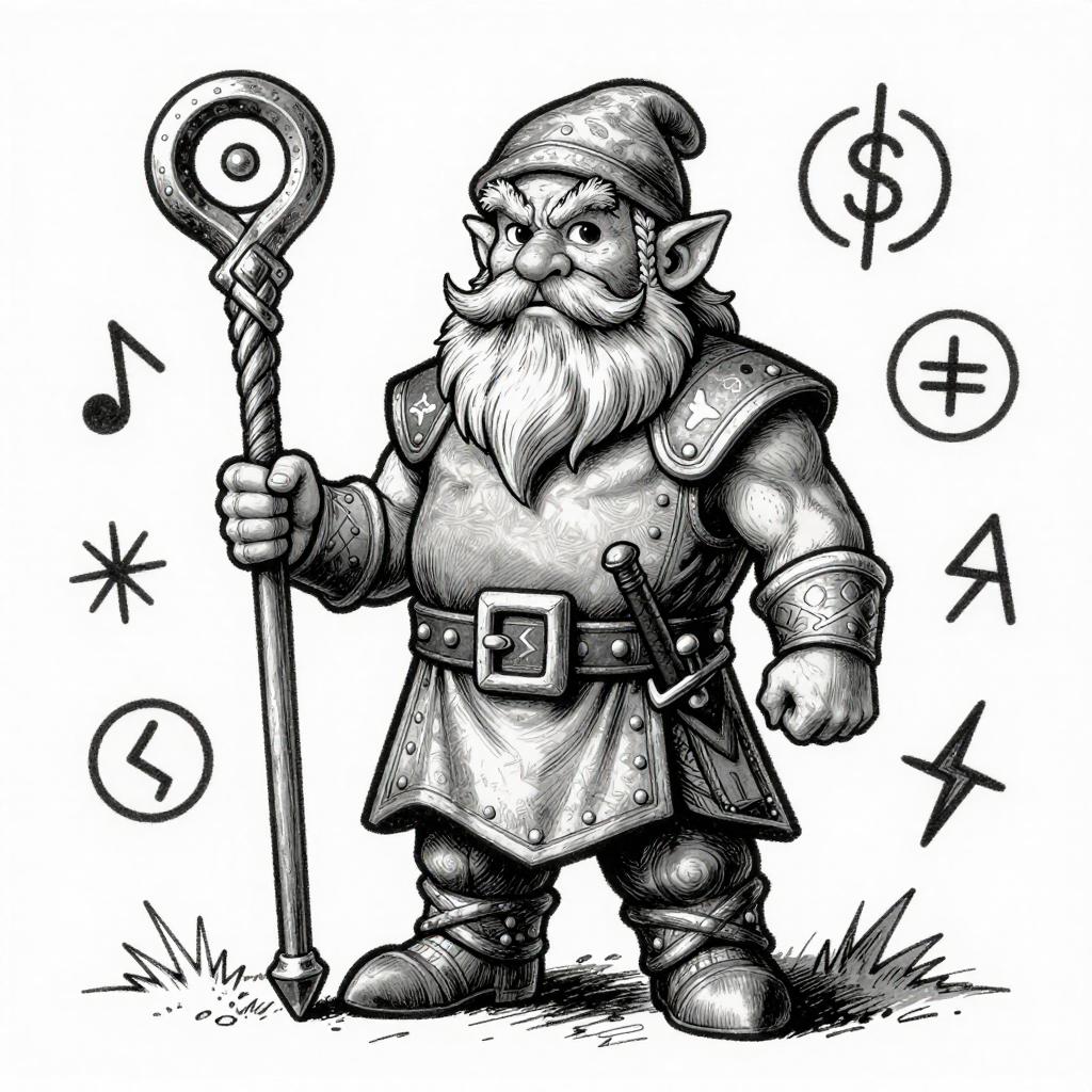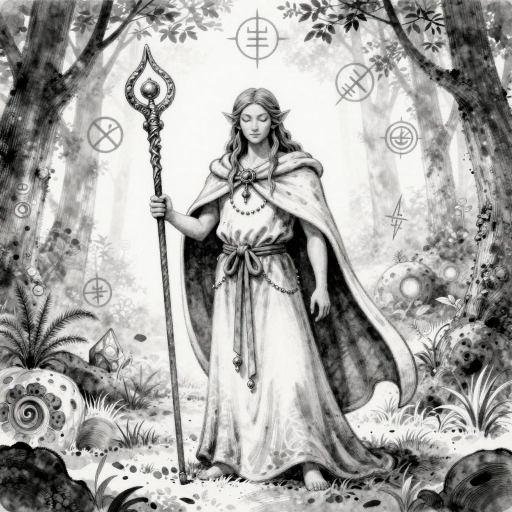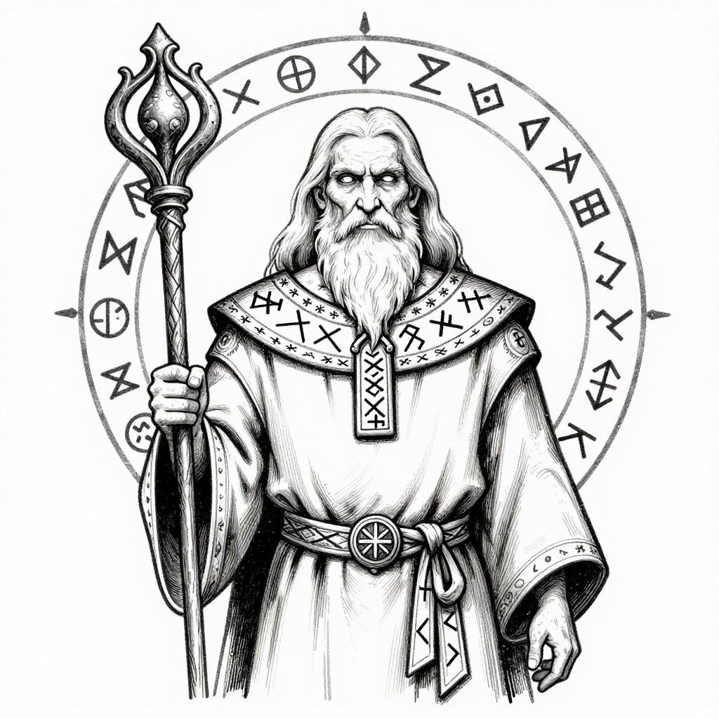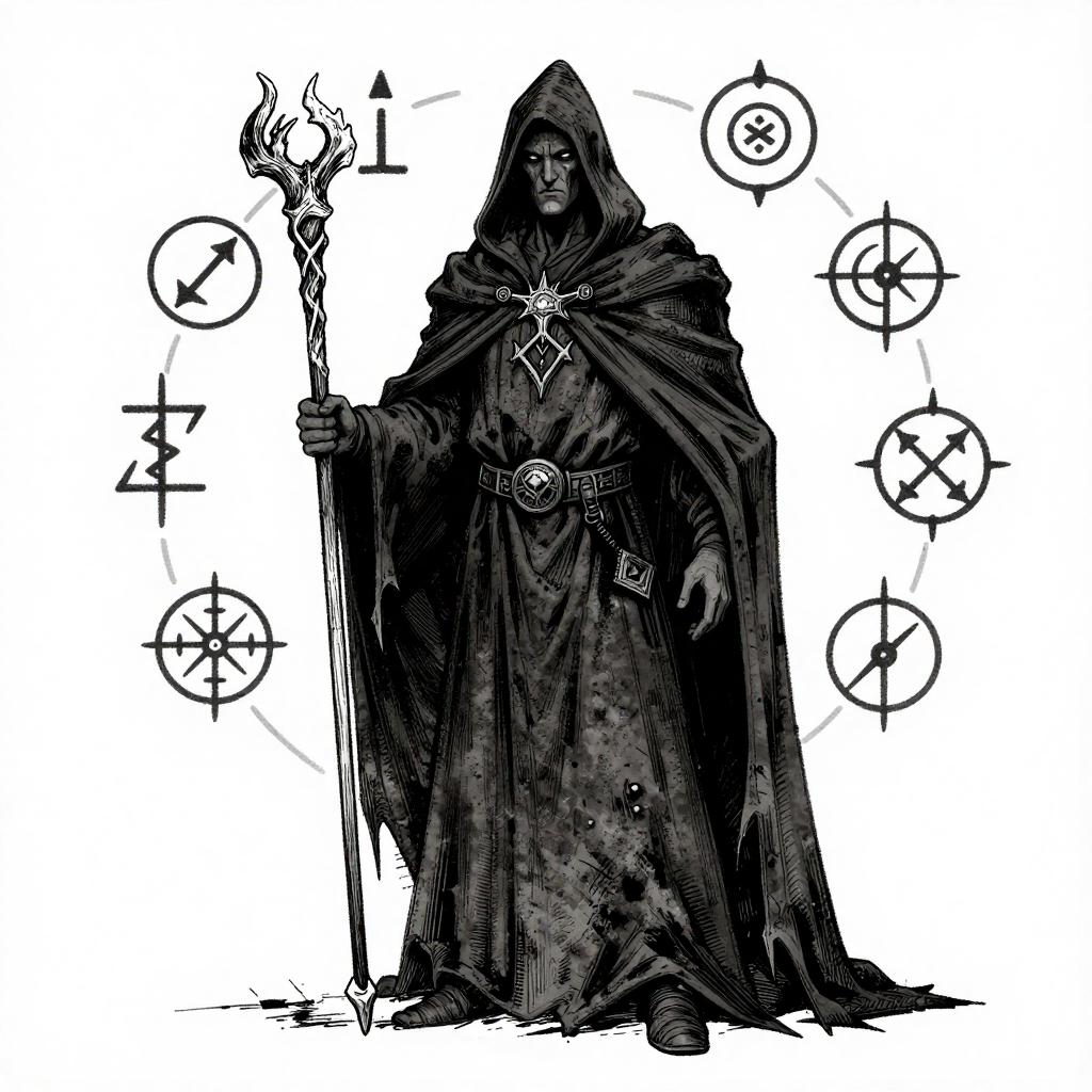 Black-and-white ink drawing of a heroic knight in shining armor, wielding a sword, surrounded by banners, traditional fantasy illustration.