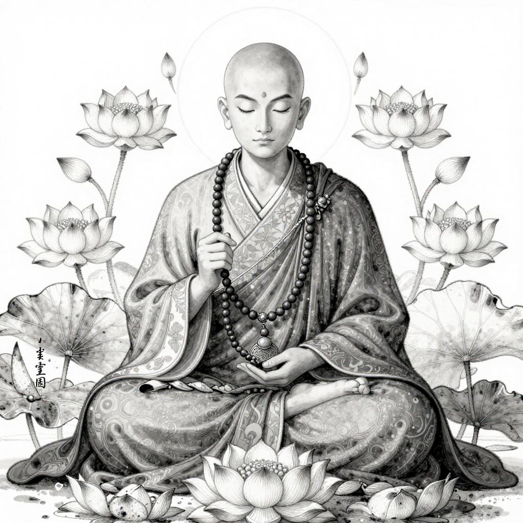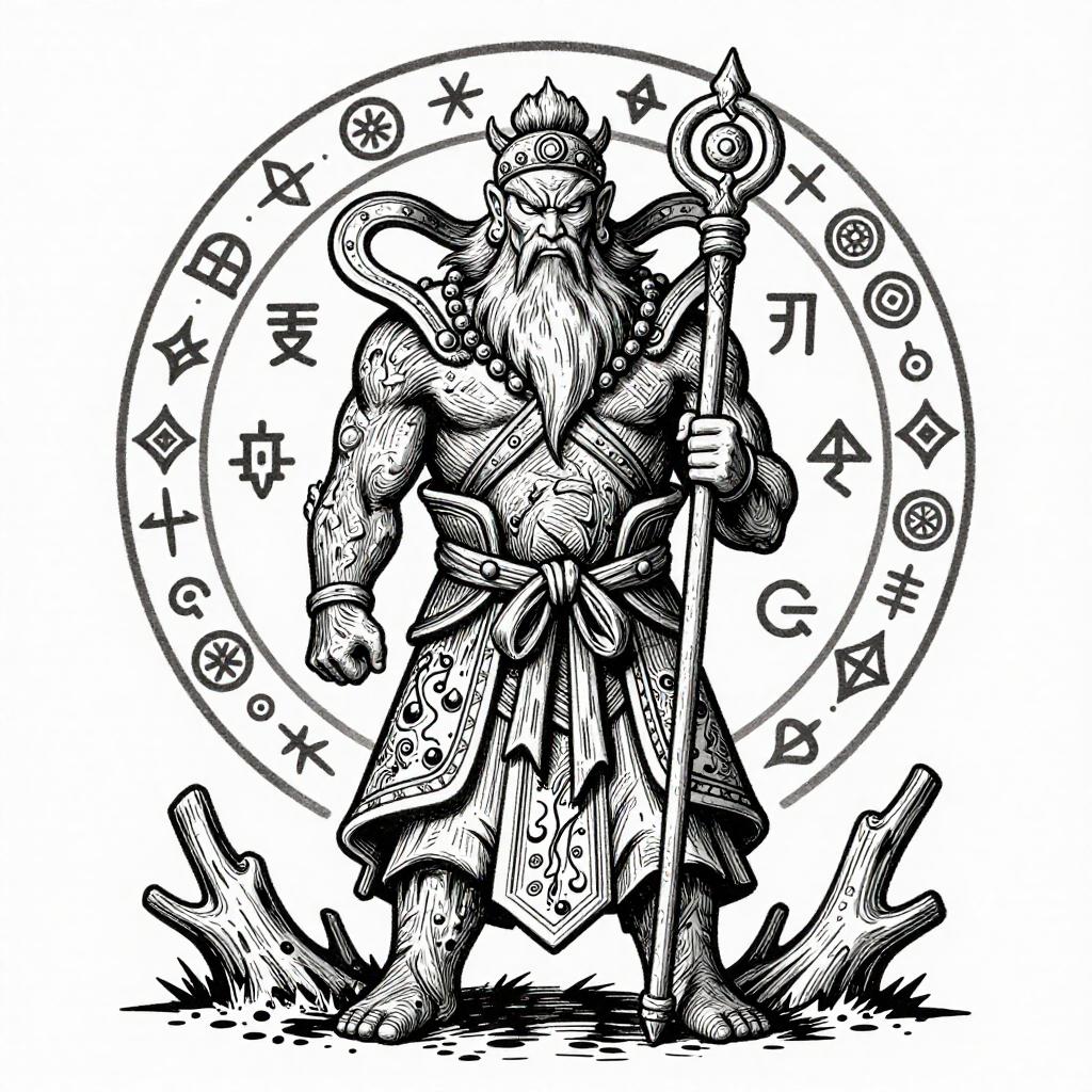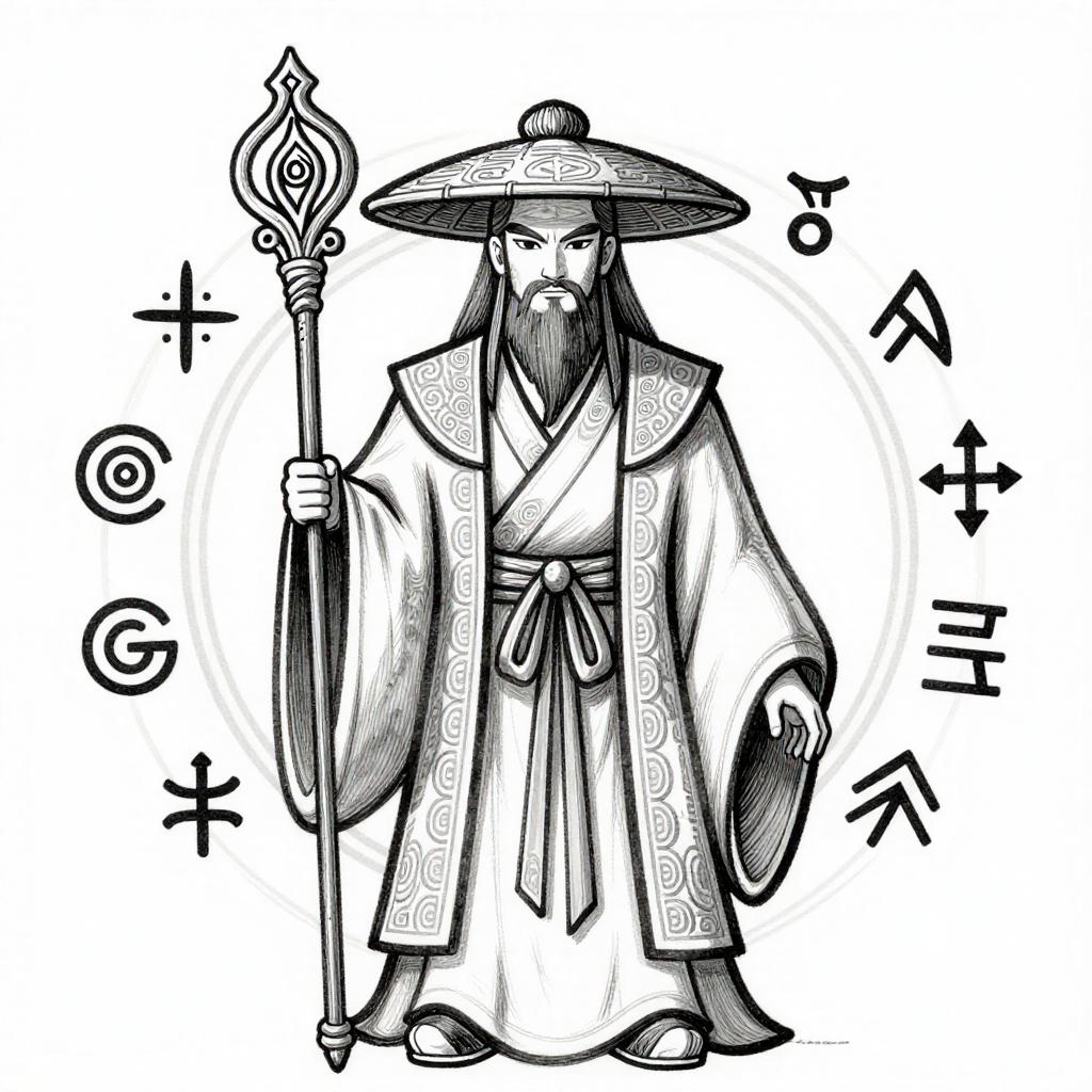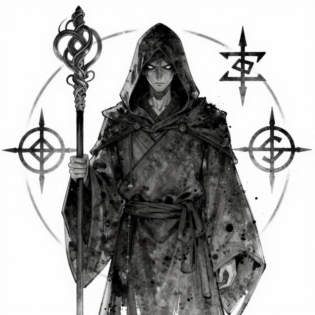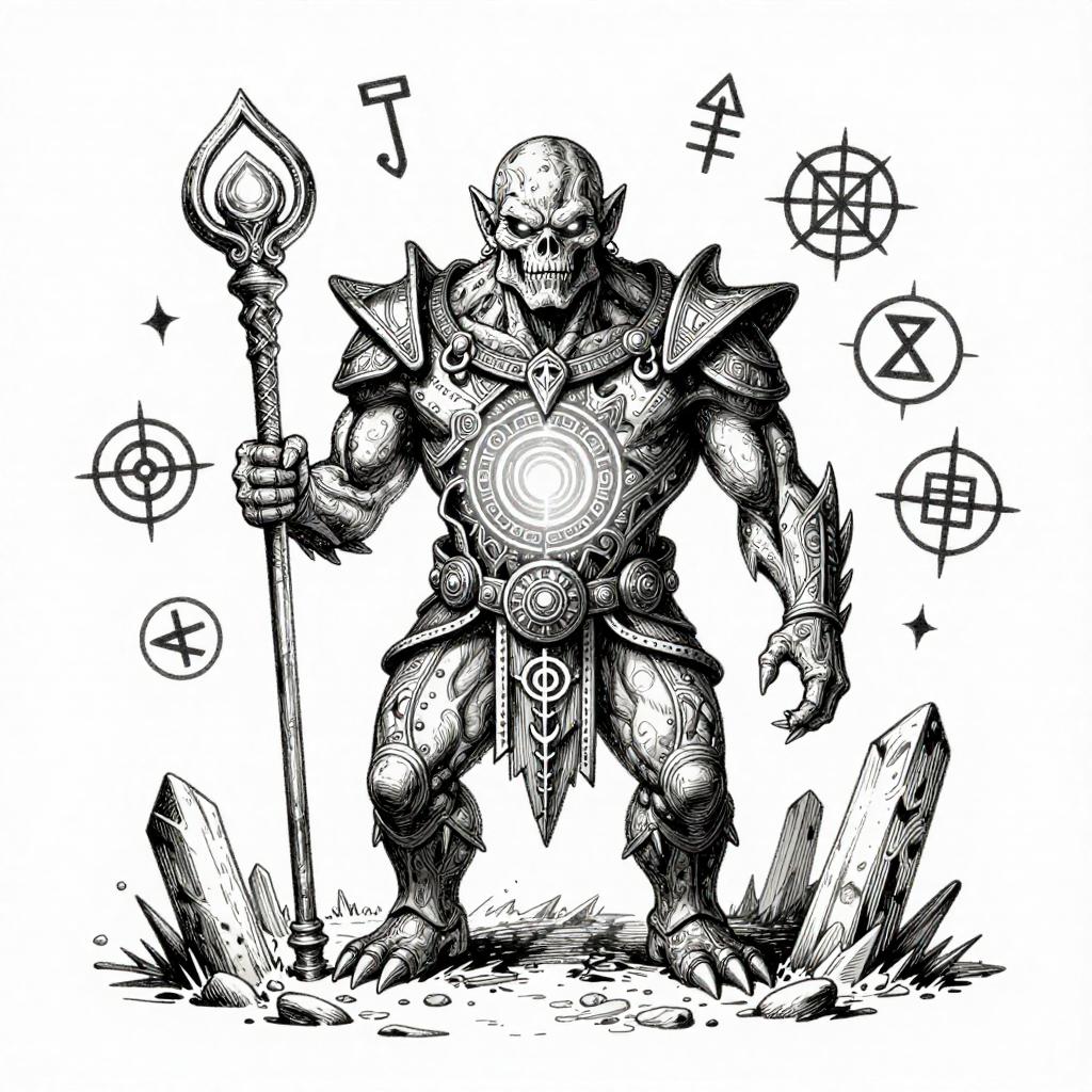 Black-and-white ink drawing of a heroic knight in shining armor, wielding a sword, surrounded by banners, traditional fantasy illustration.