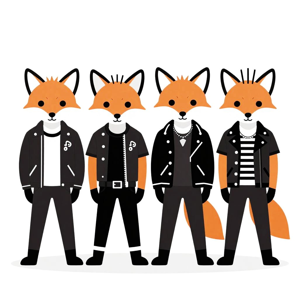 4 DIY punk foxes in a band. foxes are clad in leather with typical early 80s punk style hand drawn texture, simple black, white and gray and minimalist shapes flat colors.