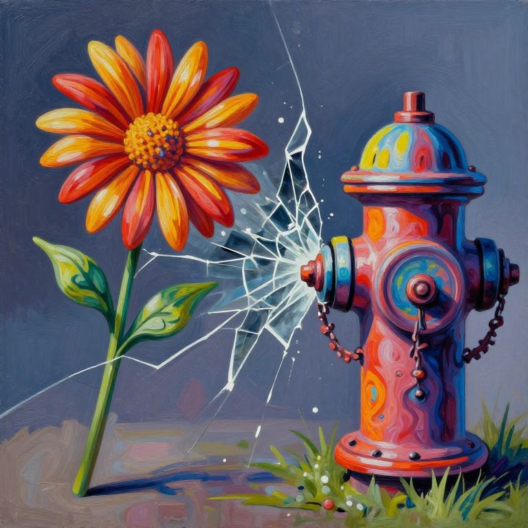 Digital painting of a vibrant red fire hydrant with shattered glass, next to a bright orange and yellow daisy, on a grassy surface with a