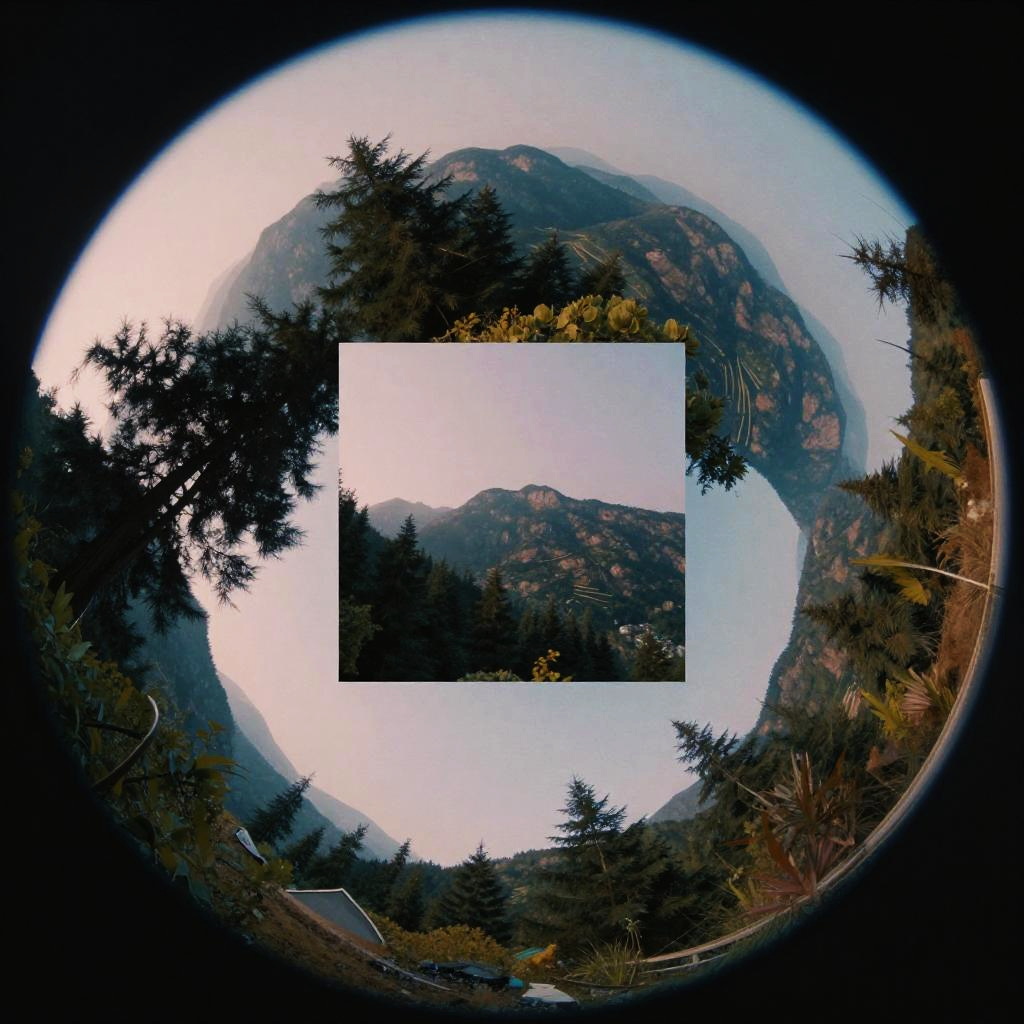 Fisheye lens album covers featuring urban cityscapes warped through distortion, neon lights glowing under a night sky, reflections and refractions creating kaleidoscopic effects, energetic and electric visual vibe with a touch of cyberpunk aesthetics.
